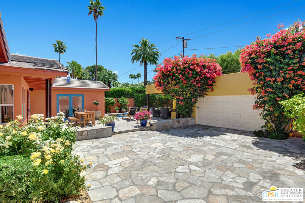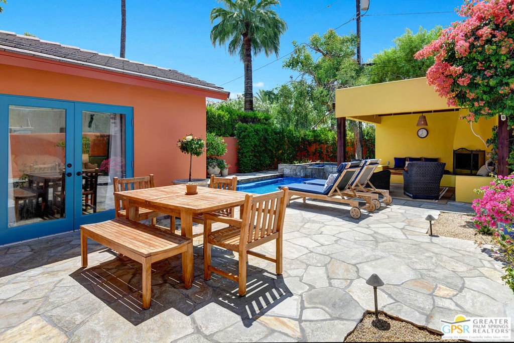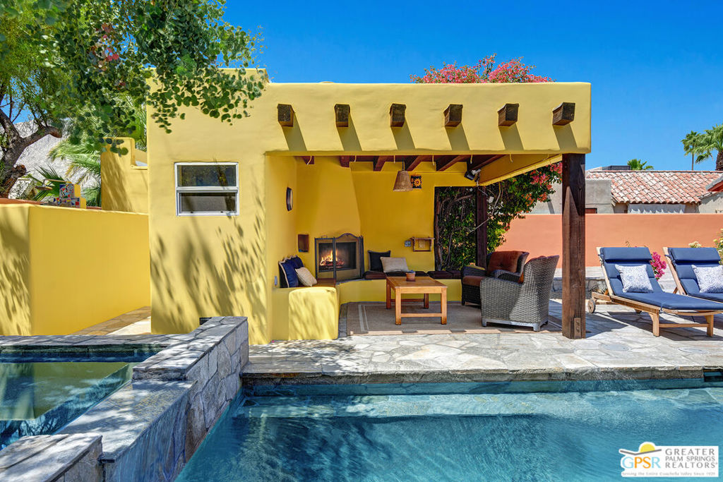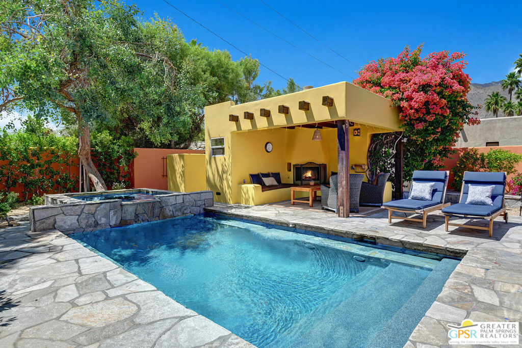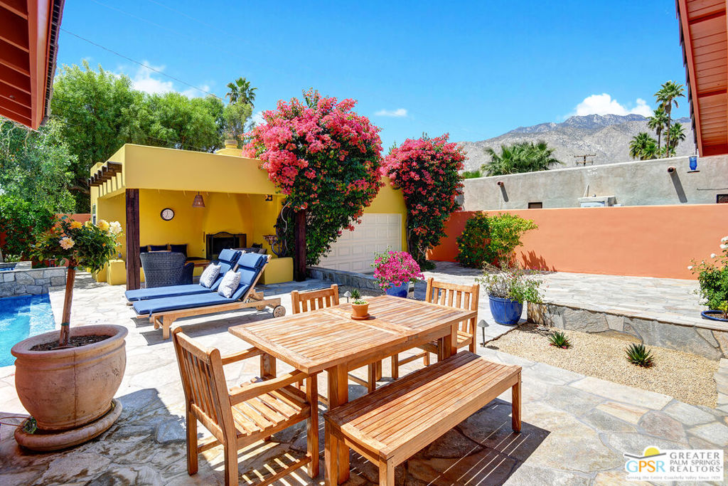 Accepting back-up Offers. Welcome to your dream oasis at 1165 E El Alameda, located in the Movie Colony East neighborhood in the heart of vibrant Palm Springs, CA. With easy access to Ruth Hardy Park and downtown, this historic single-family home offers a perfect blend of desert elegance and comfort. Spanning 1,916 square feet with 3 spacious bedrooms and 2.5 luxurious bathrooms, this fully furnished residence is an ideal retreat for those seeking a blend of relaxation and sophistication. Upon entering the property, you are greeted by a private courtyard that offers a tranquil spot with amazing mountain views. The living space has a vaulted and beamed ceiling and is enhanced by a cozy fireplace, providing an ideal spot for intimate gatherings or tranquil evenings. A separate dining room offers the perfect spot for entertaining. The modern kitchen is well-appointed and ready for culinary adventures. A large den area is great for the family and provides views and access to the backyard. The private backyard is an oasis featuring a heated pool and spa, perfect for unwinding under the sun or entertaining guests. The pool is equipped with swim jets allowing you to complete your workout without leaving home. The outdoor area is beautifully landscaped and a shaded cabana enhances the area for lounging and relaxing. The property's ample garage and private parking provide ease and security with gated entry. With its combination of elegance and historic amenities, this home offers a unique opportunity to indulge in the quintessential Palm Springs lifestyle. Offered turnkey furnished and NO HOA, don't miss your chance to make this exceptional property your own personal paradise.