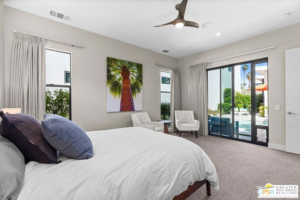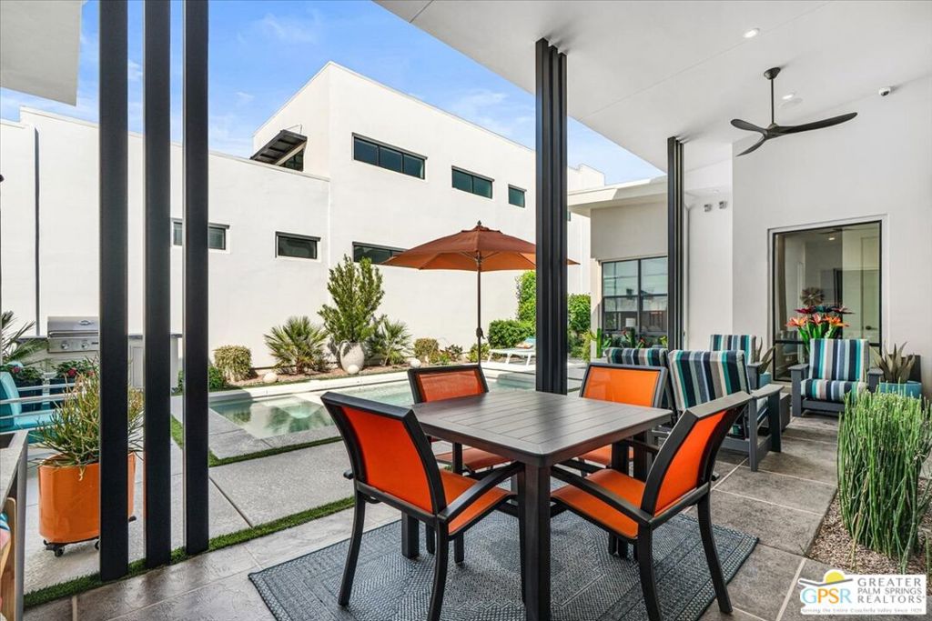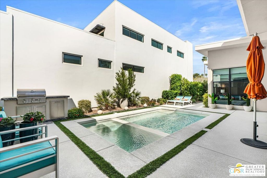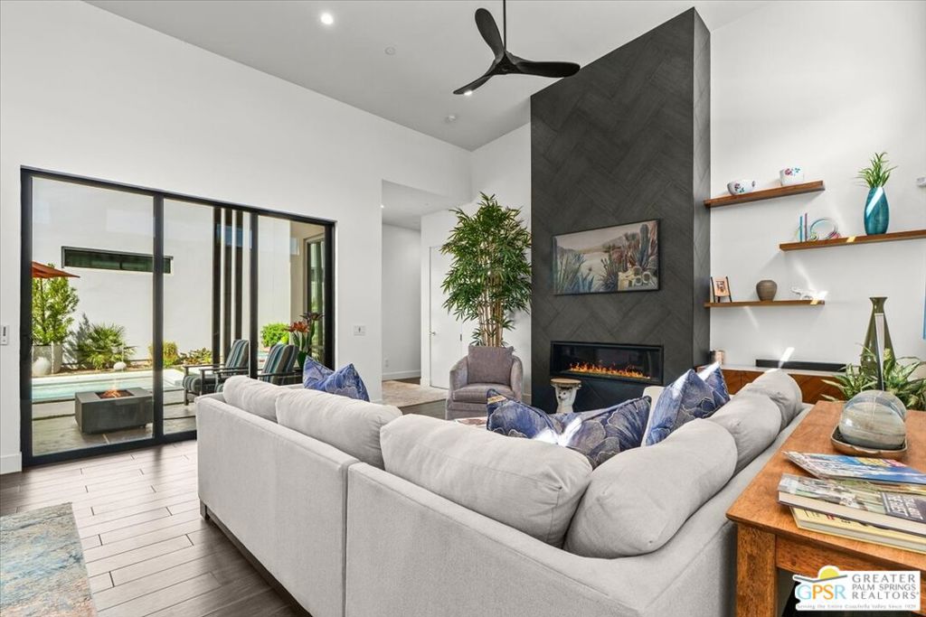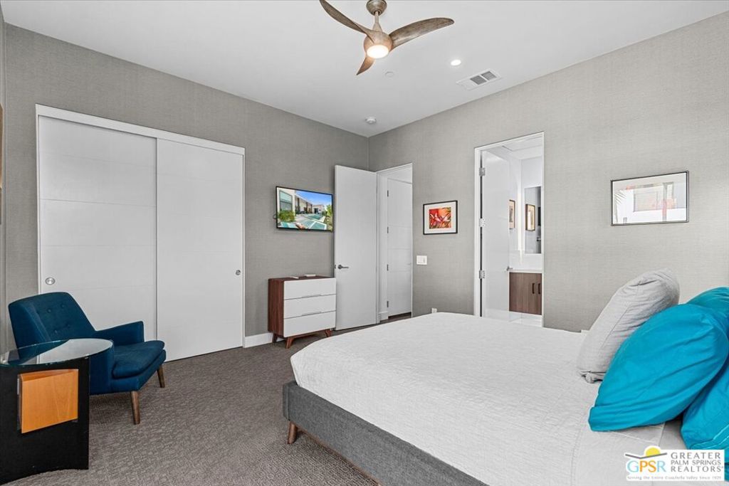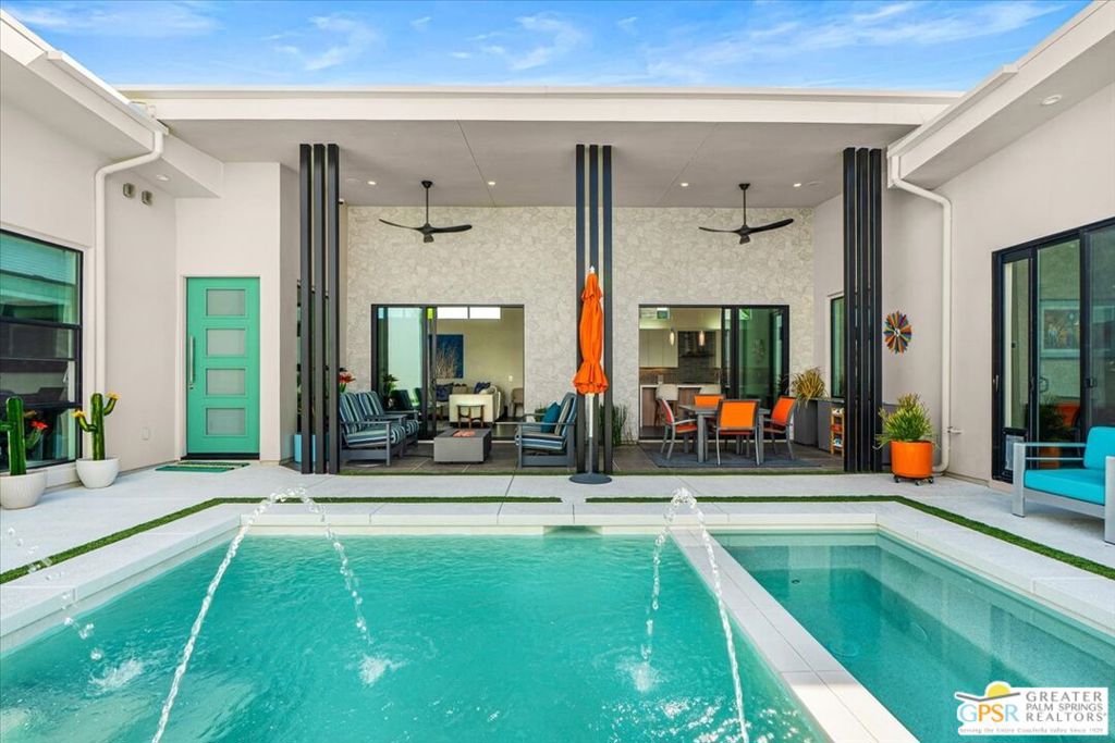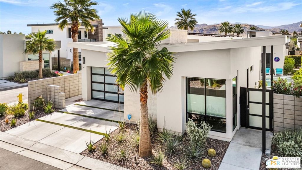 Located in the heart of vibrant Palm Springs, this modern home in the gated community of Vue is your perfect desert retreat. With 3 spacious bedrooms and 3 beautifully upgraded baths, this property is packed with luxurious features that elevate everyday living. Step inside to discover a sleek, open layout boasting a gourmet kitchen equipped with upgraded appliances, a gas fireplace for cozy evenings, and high-tech touches like electronic blinds, drapes, and a Sonos surround sound system. Ceiling fans throughout and a custom-built primary closet add both comfort and style. Outside, soak up the desert sunshine in your private oasis with dining, seating and lounging areas. The saltwater pool and spa, complete with water features and a pebble tech finish, are complemented by a Cool-Tech patio and a built-in BBQ station perfect for entertaining or unwinding under the stars. Additional perks include 34 owned solar panels with a backup battery, a full house water filtration and purification system, plus an air-conditioned, epoxy-floored 2-car garage. For added peace of mind, the home is equipped with an alarm system, cameras, a DoorBird entry system and whole house surge protection. This is more than just a home; it's a lifestyle. Don't miss your chance to own this stunning Palm Springs gem!