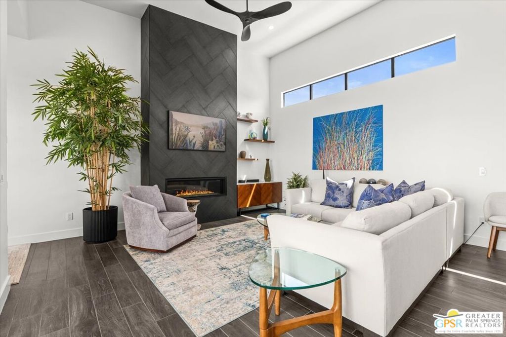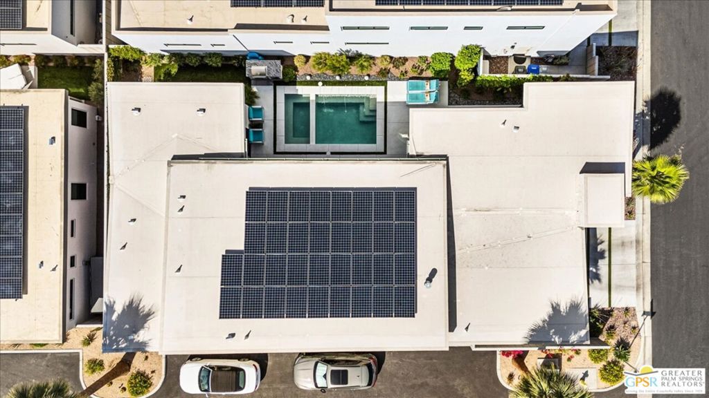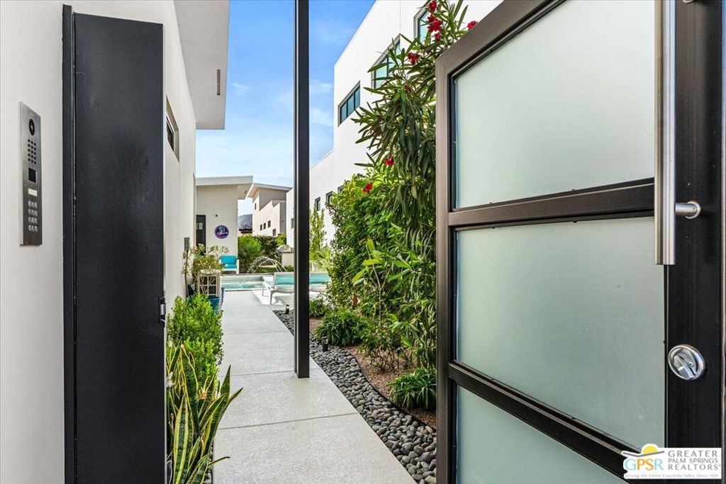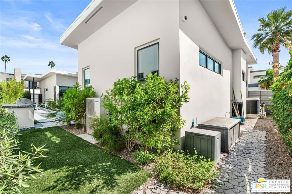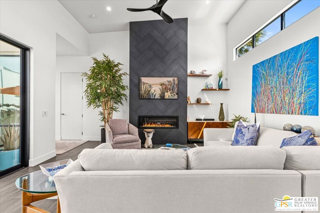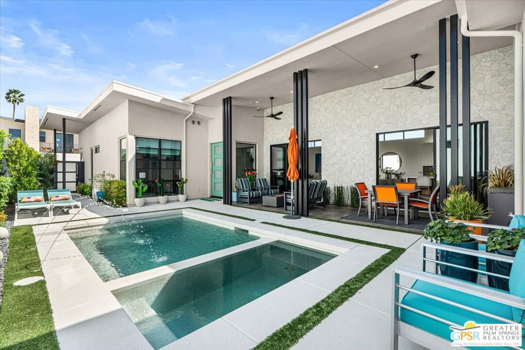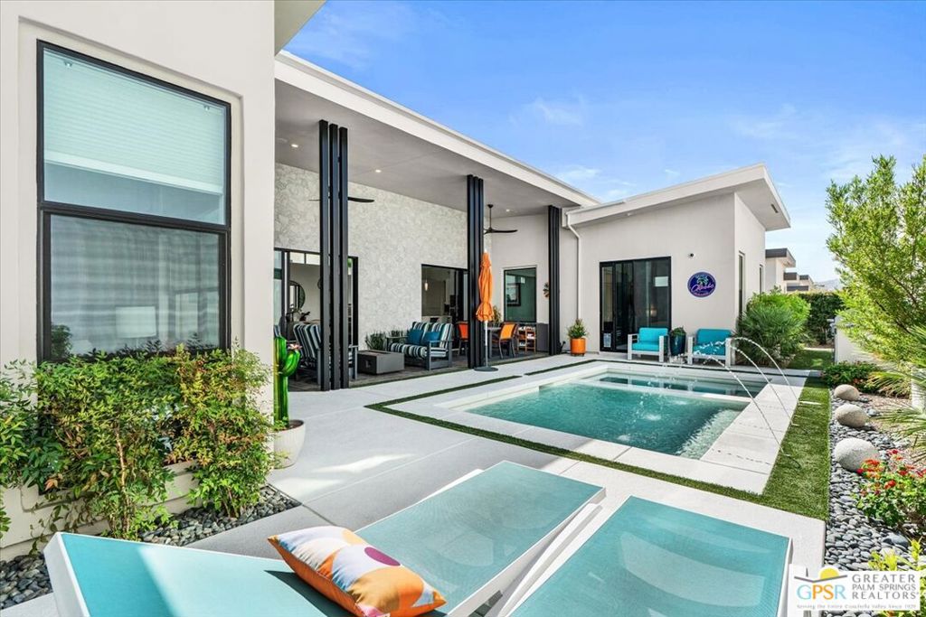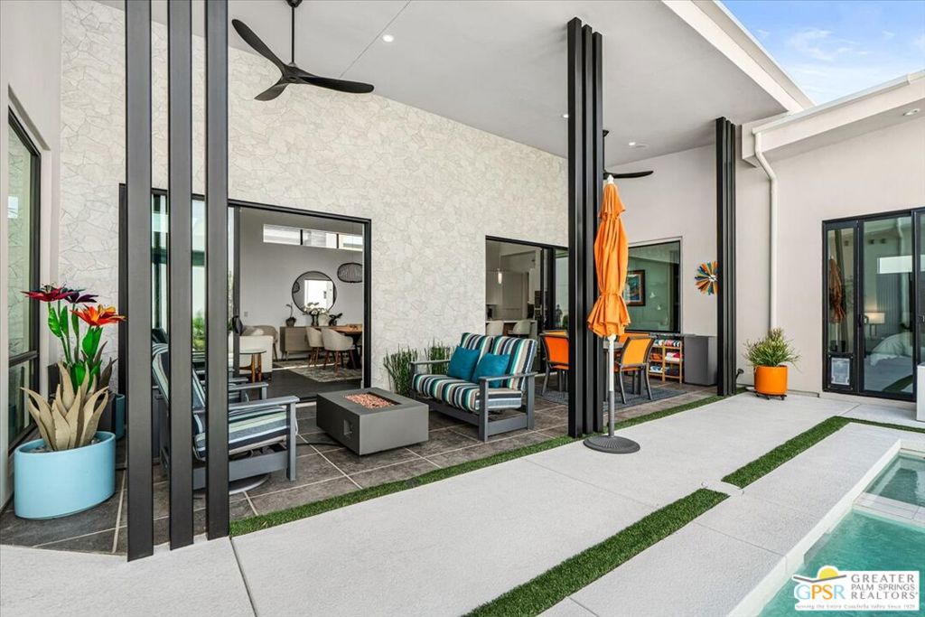 Located in the heart of vibrant Palm Springs, this modern home in the gated community of Vue is your perfect desert retreat. With 3 spacious bedrooms and 3 beautifully upgraded baths, this property is packed with luxurious features that elevate everyday living. Step inside to discover a sleek, open layout boasting a gourmet kitchen equipped with upgraded appliances, a gas fireplace for cozy evenings, and high-tech touches like electronic blinds, drapes, and a Sonos surround sound system. Ceiling fans throughout and a custom-built primary closet add both comfort and style. Outside, soak up the desert sunshine in your private oasis with dining, seating and lounging areas. The saltwater pool and spa, complete with water features and a pebble tech finish, are complemented by a Cool-Tech patio and a built-in BBQ station perfect for entertaining or unwinding under the stars. Additional perks include 34 owned solar panels with a backup battery, a full house water filtration and purification system, plus an air-conditioned, epoxy-floored 2-car garage. For added peace of mind, the home is equipped with an alarm system, cameras, a DoorBird entry system and whole house surge protection. This is more than just a home; it's a lifestyle. Don't miss your chance to own this stunning Palm Springs gem!