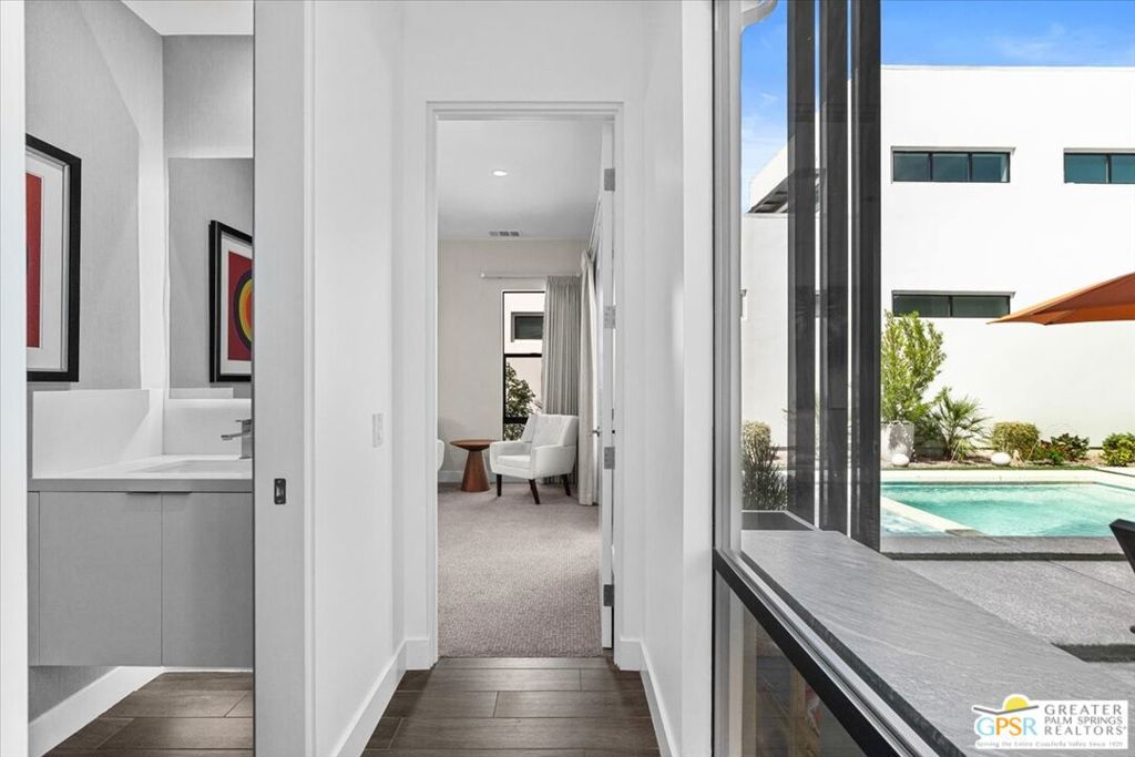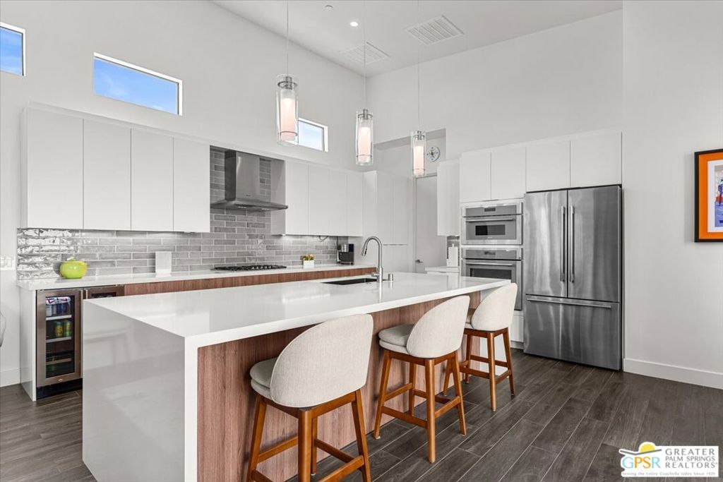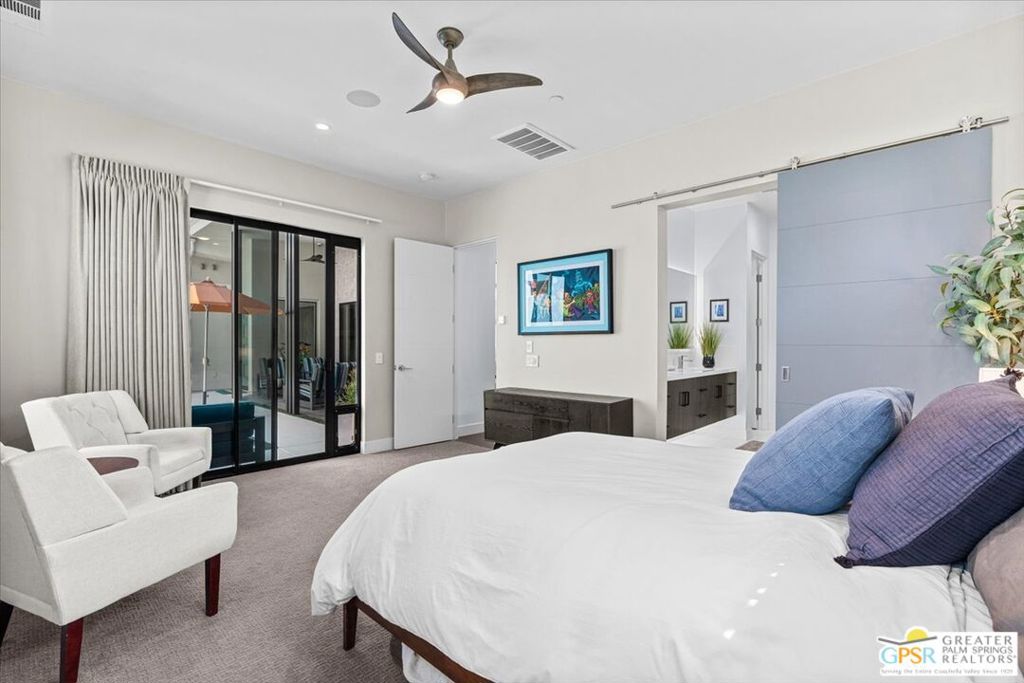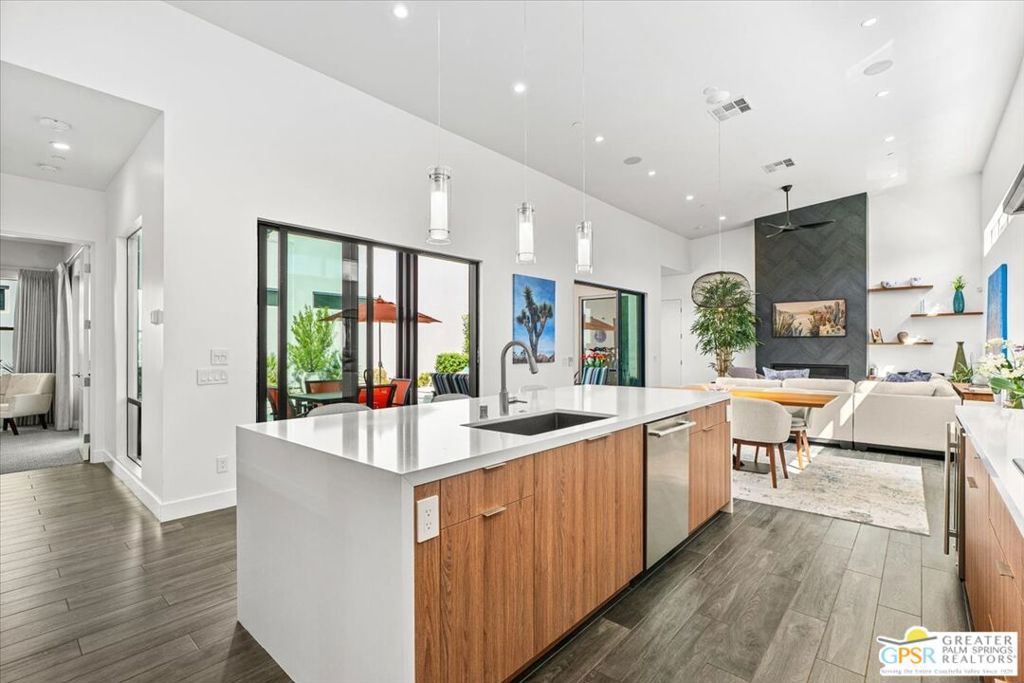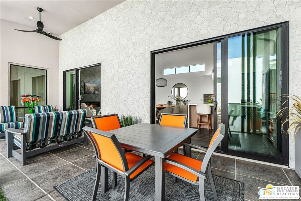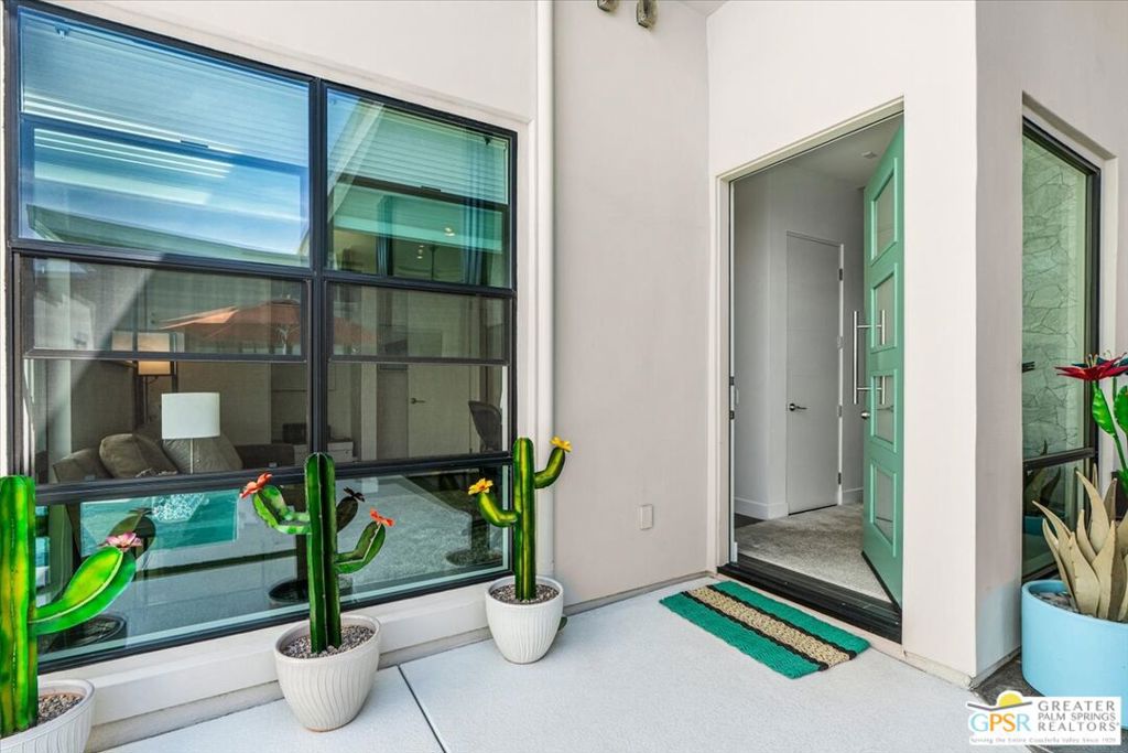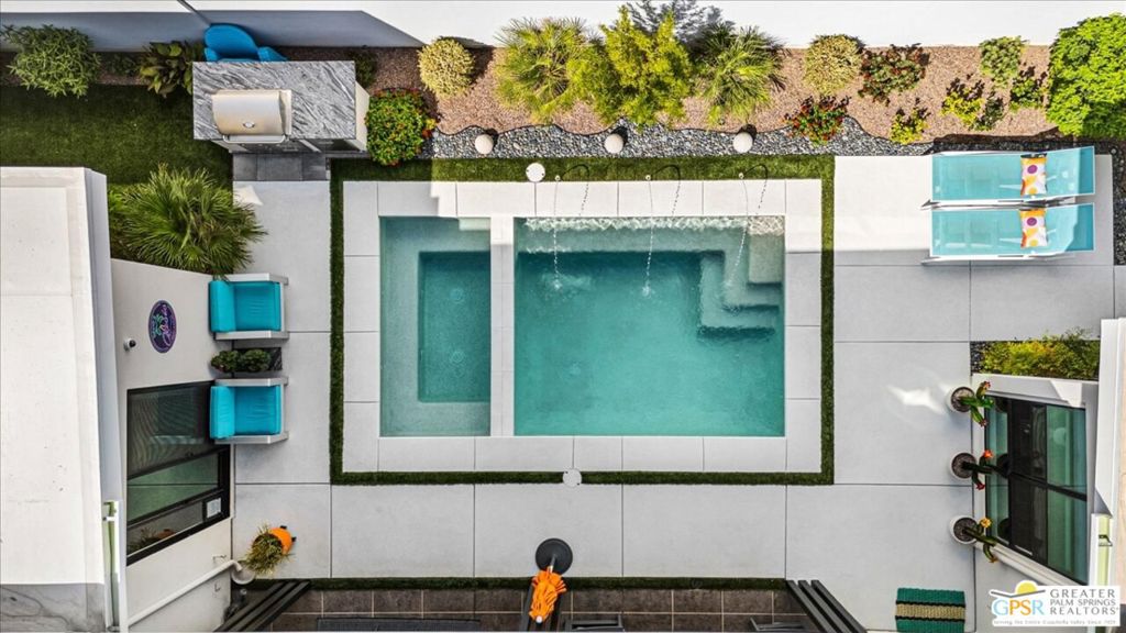 Located in the heart of vibrant Palm Springs, this modern home in the gated community of Vue is your perfect desert retreat. With 3 spacious bedrooms and 3 beautifully upgraded baths, this property is packed with luxurious features that elevate everyday living. Step inside to discover a sleek, open layout boasting a gourmet kitchen equipped with upgraded appliances, a gas fireplace for cozy evenings, and high-tech touches like electronic blinds, drapes, and a Sonos surround sound system. Ceiling fans throughout and a custom-built primary closet add both comfort and style. Outside, soak up the desert sunshine in your private oasis with dining, seating and lounging areas. The saltwater pool and spa, complete with water features and a pebble tech finish, are complemented by a Cool-Tech patio and a built-in BBQ station perfect for entertaining or unwinding under the stars. Additional perks include 34 owned solar panels with a backup battery, a full house water filtration and purification system, plus an air-conditioned, epoxy-floored 2-car garage. For added peace of mind, the home is equipped with an alarm system, cameras, a DoorBird entry system and whole house surge protection. This is more than just a home; it's a lifestyle. Don't miss your chance to own this stunning Palm Springs gem!