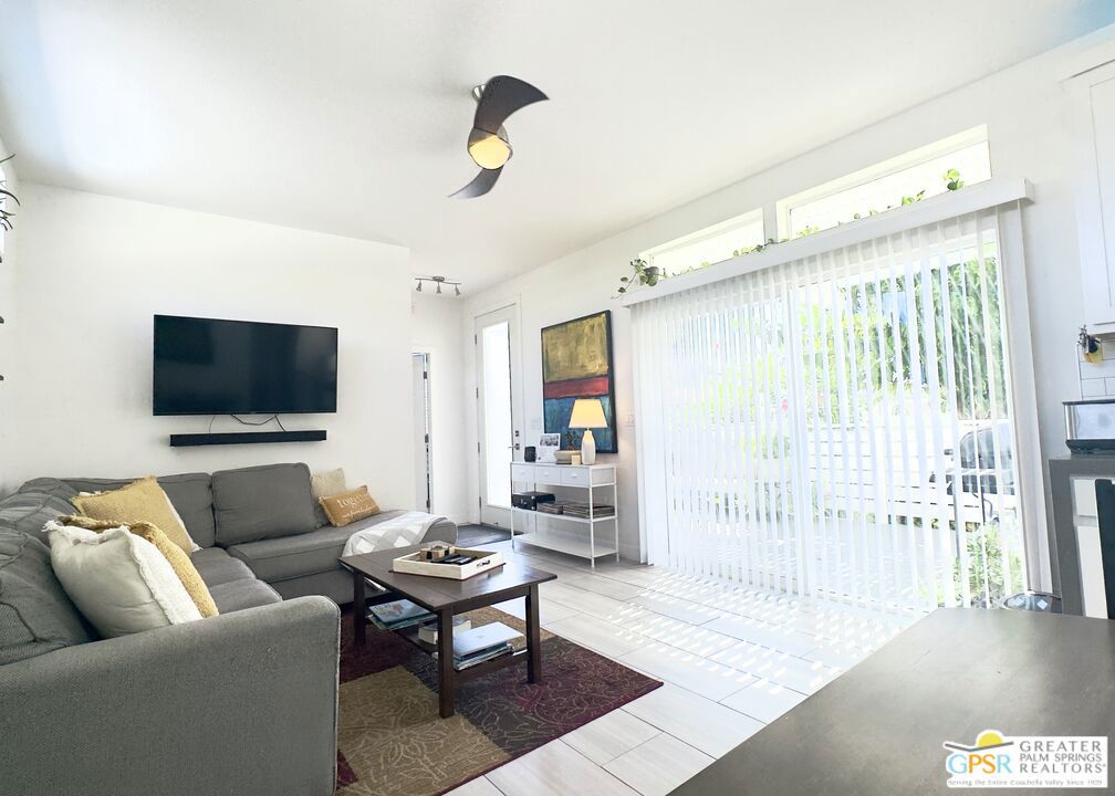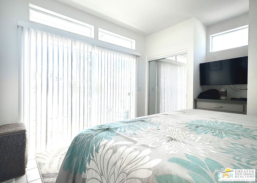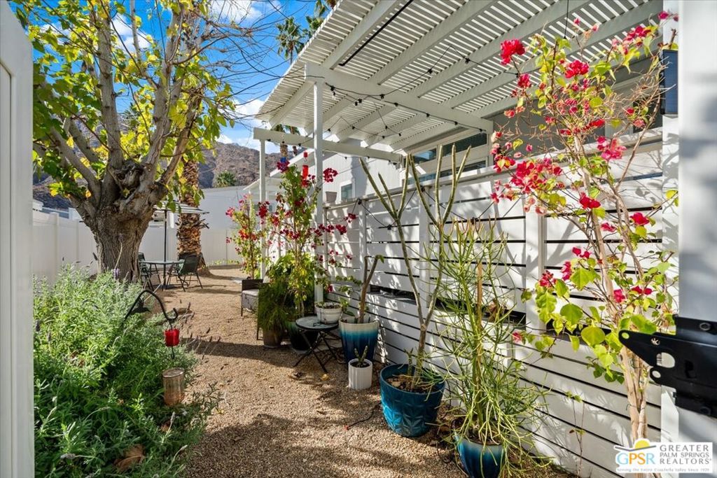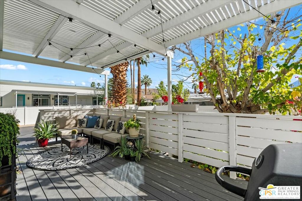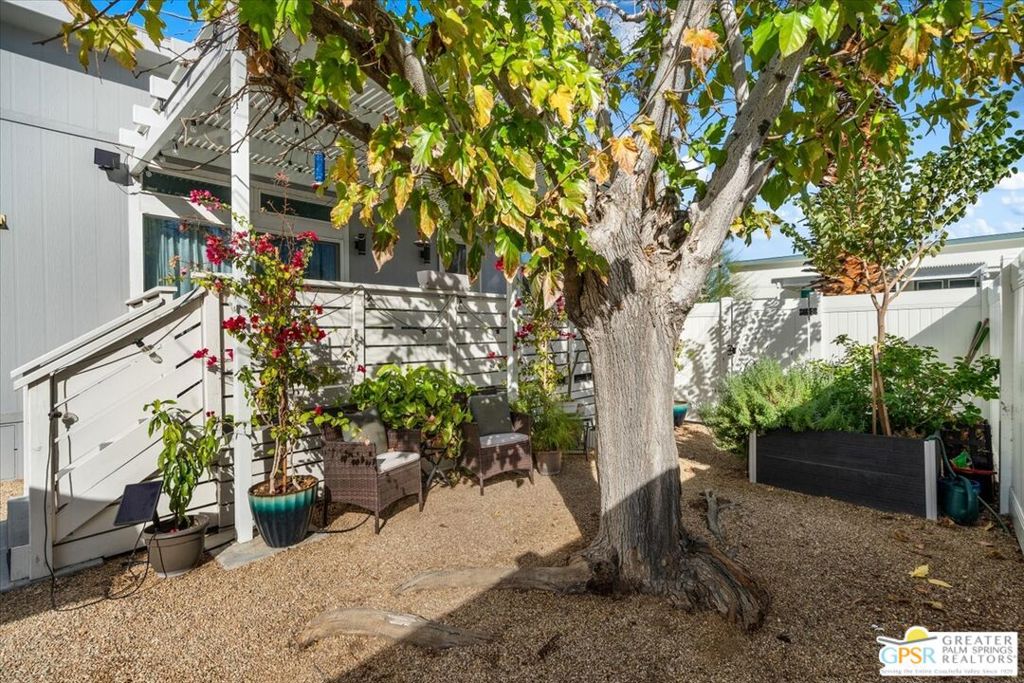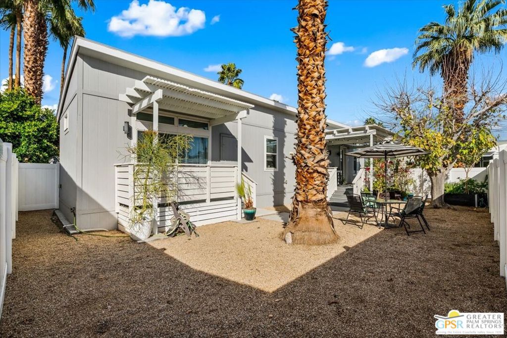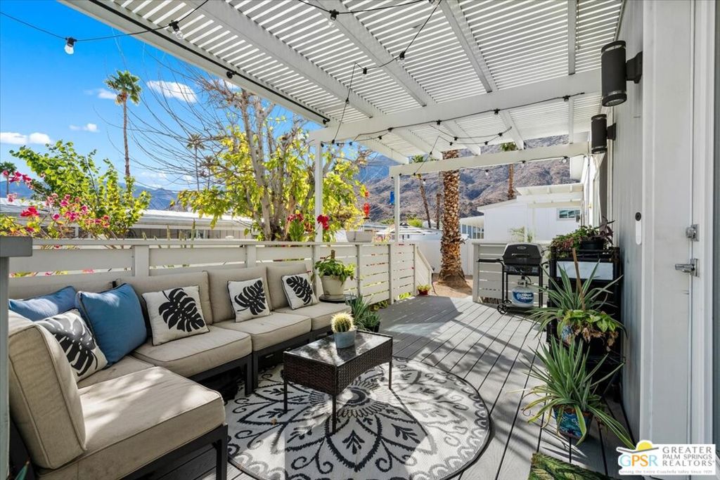 Welcome to 226 Lei Drive, Palm Springs, CA your modern retreat in the heart of the desert. This charming 2-bedroom, 2-bathroom home spans 800 square feet and offers a blend of comfort and style. Inside, you'll find a bright and inviting living space, enhanced by clerestory windows and sliders to the deck with new vertical blinds. The well-appointed kitchen features ample storage and seamlessly connects to a cozy dining area, making it ideal for both everyday living and entertaining. The primary bedroom boasts an en-suite bathroom, while the second bedroom provides versatile space with a Murphy bed, perfect for guests, studio space or home office. Each room is thoughtfully designed to maximize both comfort and functionality and new blinds installed in each. A stacked washer/dryer is included. Step outside to the covered outdoor deck and your private yard, where you can unwind and take in the breathtaking mountain views. This space is perfect for barbecues, morning coffee, or simply enjoying the serene surroundings. The home also includes 11 owned solar panels, offering significant energy savings and sustainability. A space & private yard contains an outdoor dining area complete with new pavers. Covered parking is attached to the home for convenience. This property is located in a community rich with amenities. Enjoy a dip in the large pool, relax in the spa, stay active in the gym, or socialize in the clubhouse with its game room/lounge. Additional features include a shuffleboard court and a dog park. Experience the best of Palm Springs living at 226 Lei Drive.