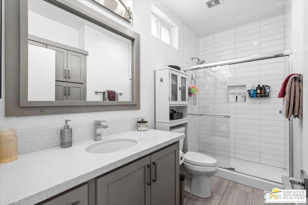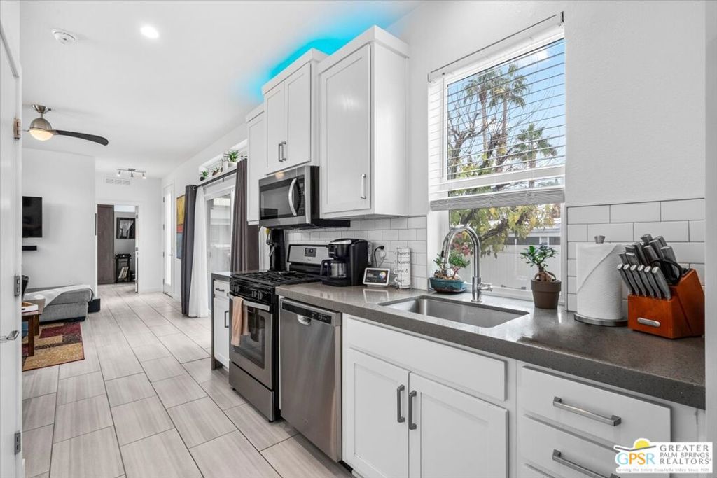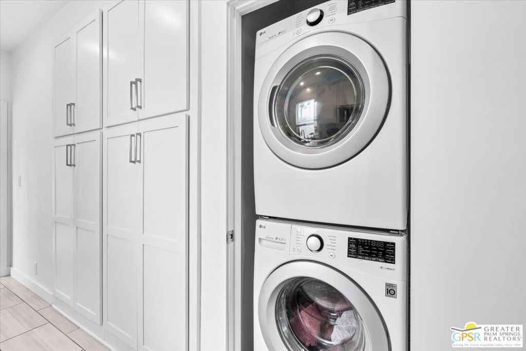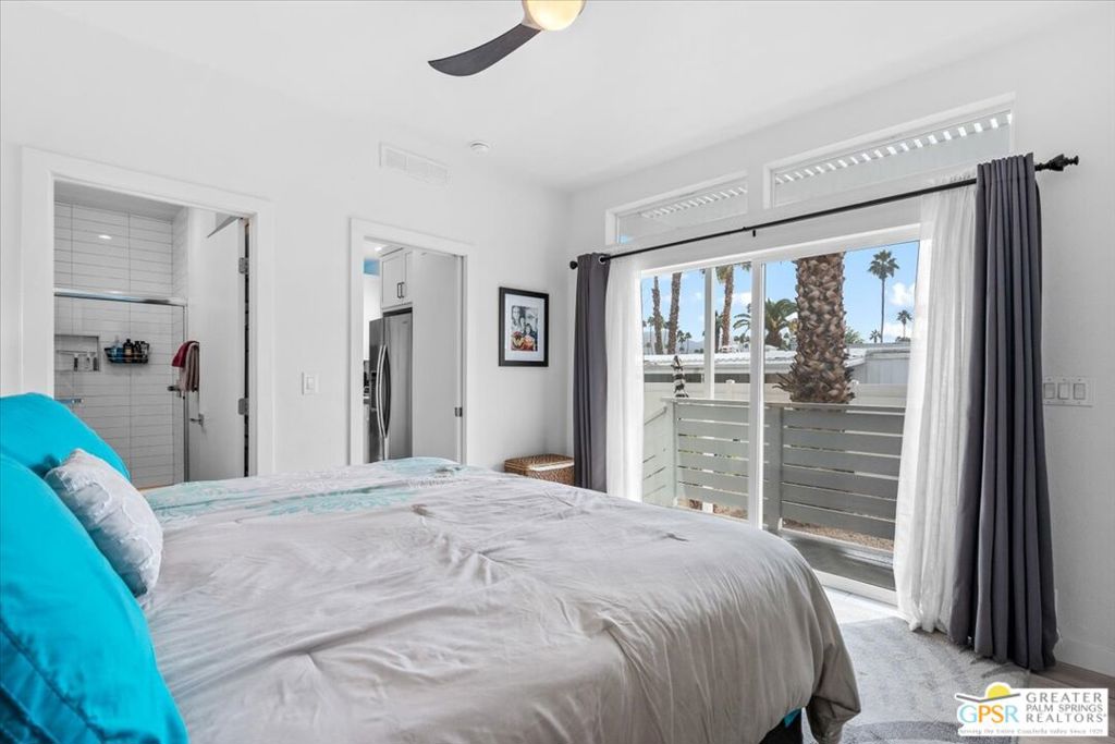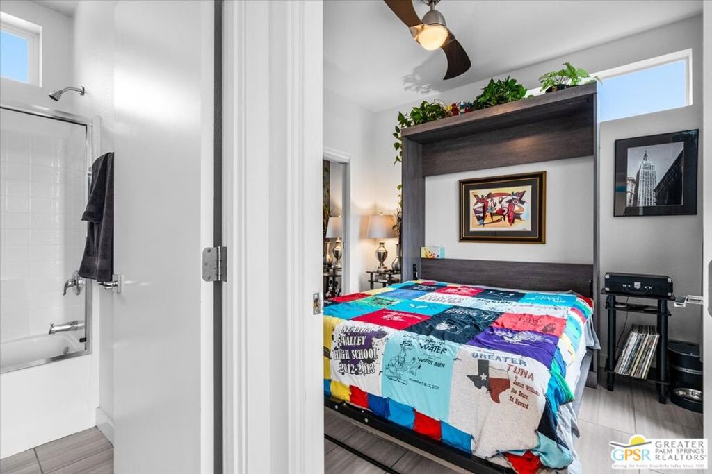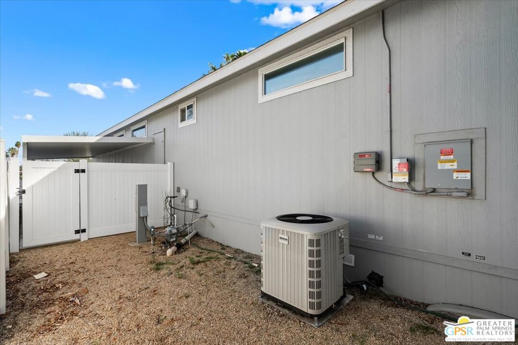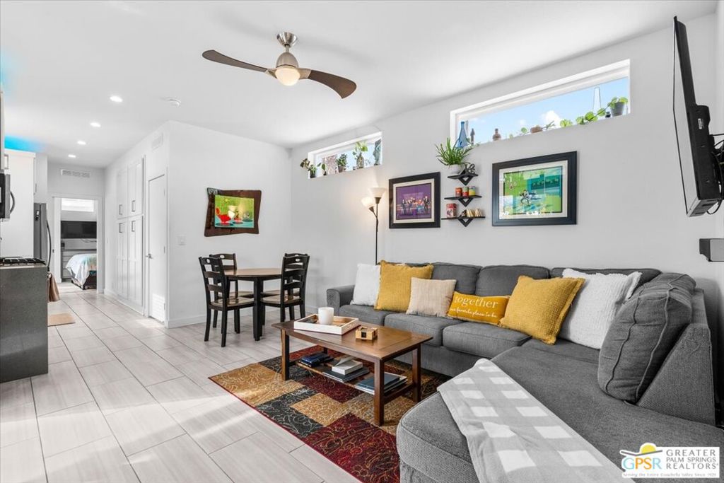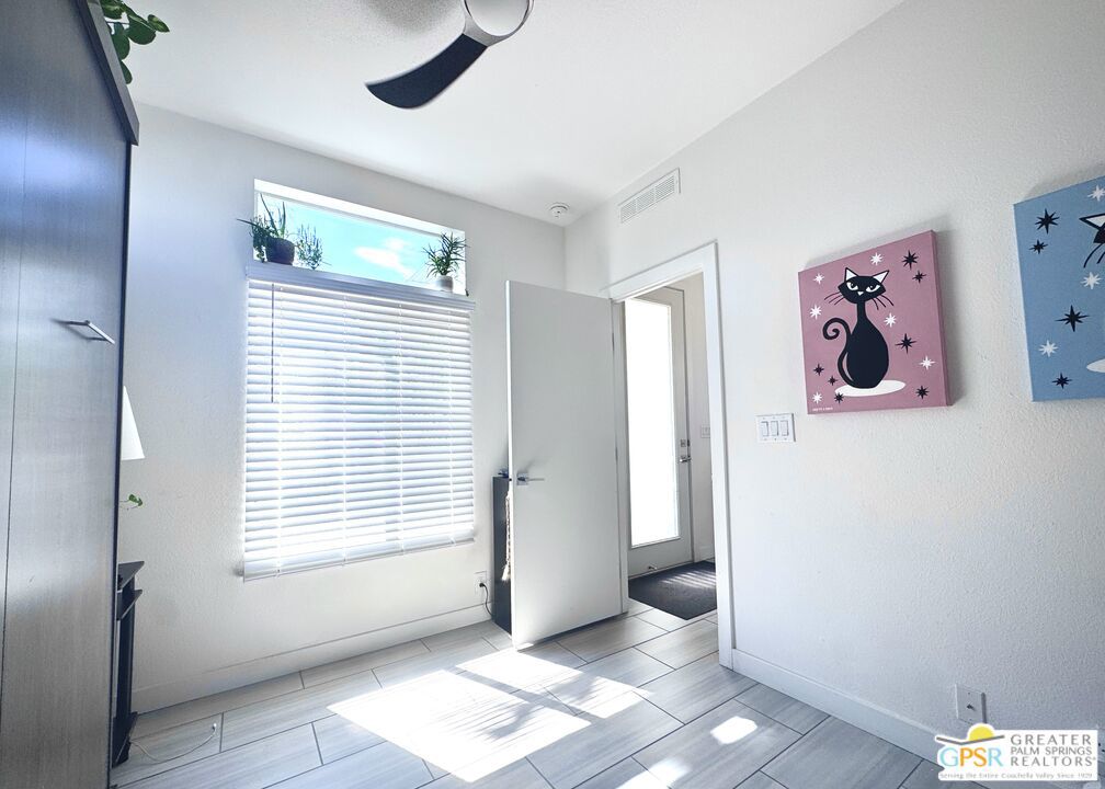 Welcome to 226 Lei Drive, Palm Springs, CA your modern retreat in the heart of the desert. This charming 2-bedroom, 2-bathroom home spans 800 square feet and offers a blend of comfort and style. Inside, you'll find a bright and inviting living space, enhanced by clerestory windows and sliders to the deck with new vertical blinds. The well-appointed kitchen features ample storage and seamlessly connects to a cozy dining area, making it ideal for both everyday living and entertaining. The primary bedroom boasts an en-suite bathroom, while the second bedroom provides versatile space with a Murphy bed, perfect for guests, studio space or home office. Each room is thoughtfully designed to maximize both comfort and functionality and new blinds installed in each. A stacked washer/dryer is included. Step outside to the covered outdoor deck and your private yard, where you can unwind and take in the breathtaking mountain views. This space is perfect for barbecues, morning coffee, or simply enjoying the serene surroundings. The home also includes 11 owned solar panels, offering significant energy savings and sustainability. A space & private yard contains an outdoor dining area complete with new pavers. Covered parking is attached to the home for convenience. This property is located in a community rich with amenities. Enjoy a dip in the large pool, relax in the spa, stay active in the gym, or socialize in the clubhouse with its game room/lounge. Additional features include a shuffleboard court and a dog park. Experience the best of Palm Springs living at 226 Lei Drive.