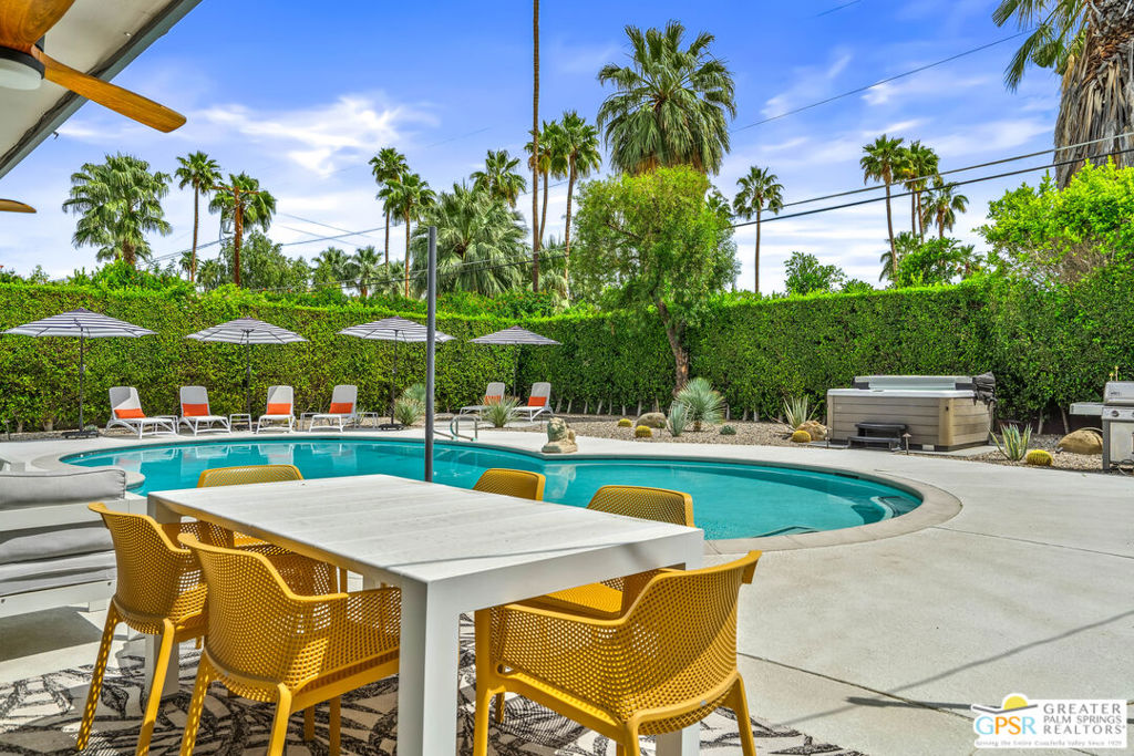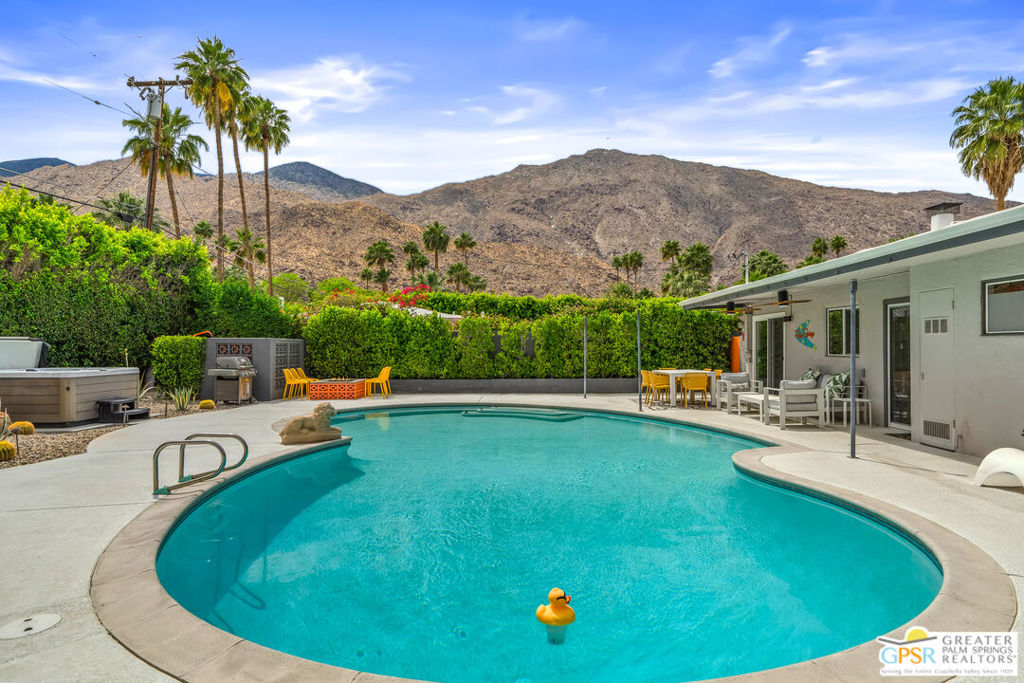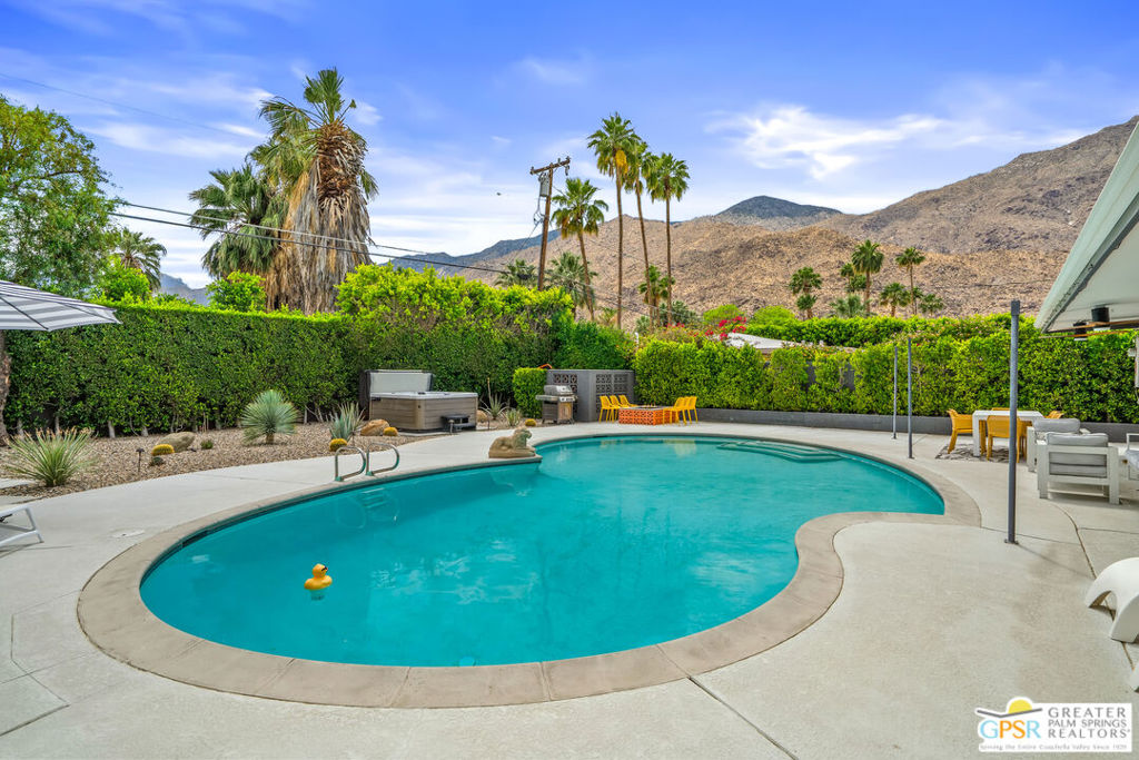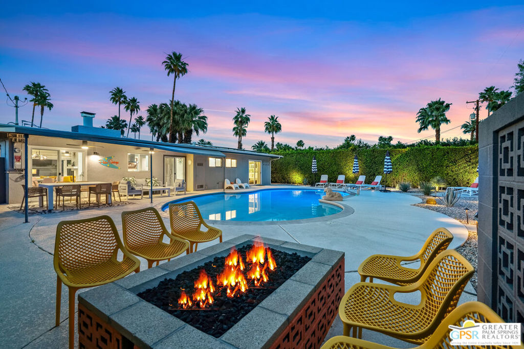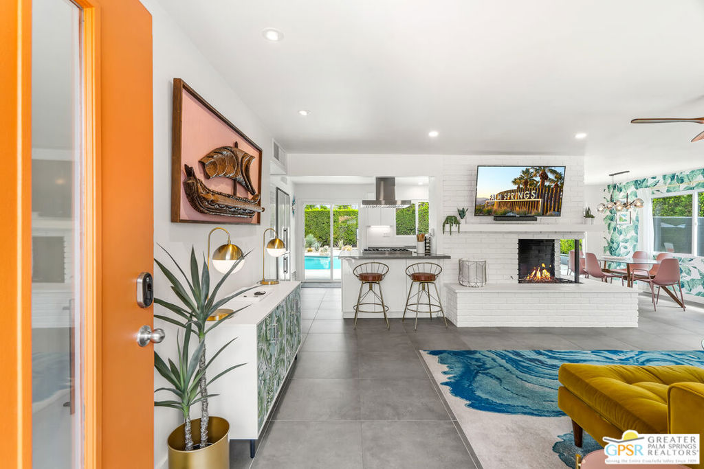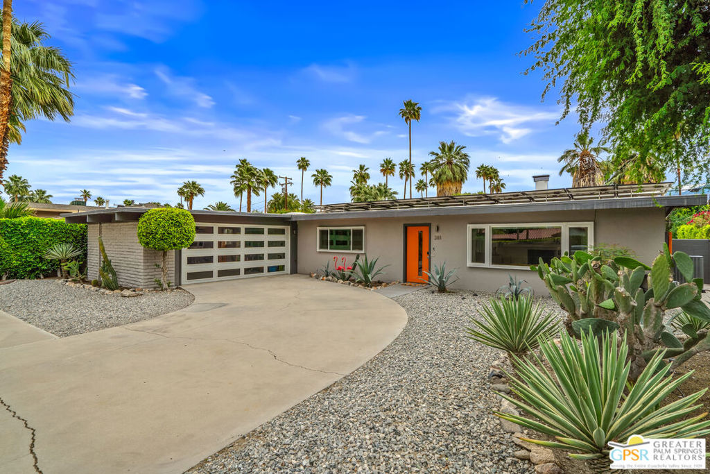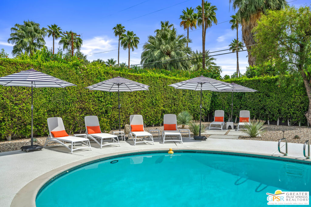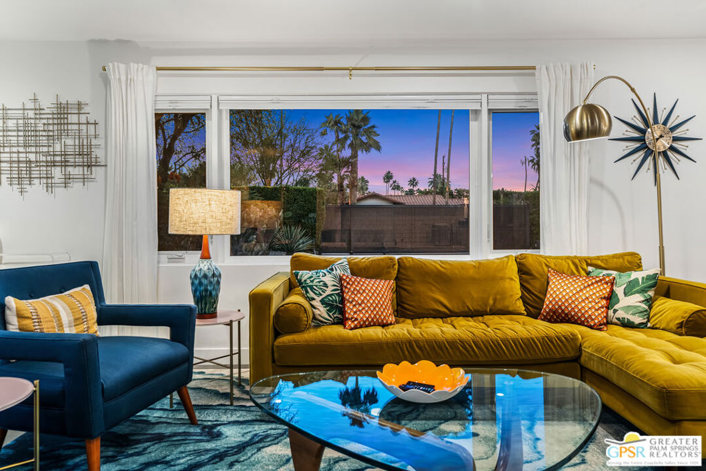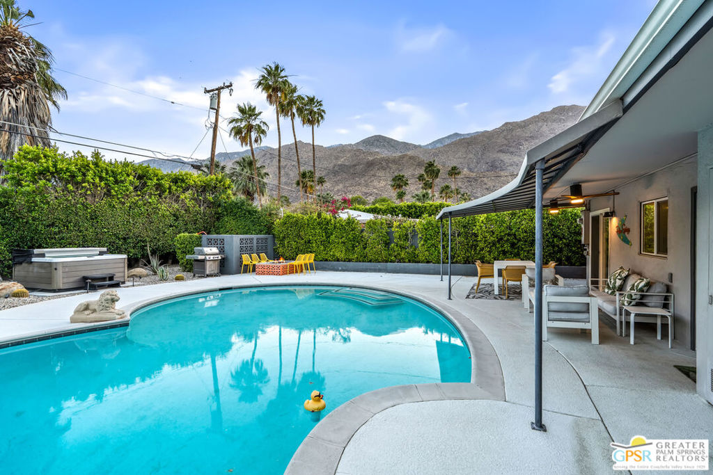 Looking for the perfect ready to enjoy, furnished Palm Springs home? Recently renovated, furnishings included and great short term rental potential! Welcome to 281 Ocotillo Avenue, where mid-century allure perfectly blends with modern luxury in the vibrant heart of Palm Springs! Discreetly hidden behind a privacy hedge on a tranquil street in the coveted Tahquitz River Estates neighborhood, this gated home blends architectural character with contemporary sophistication. This three-bedroom, two-bathroom atomic-ranch is an oasis of comfort and style. Picture yourself in the open living area, where iconic mid-century details like the stunning brick fireplace and expansive windows create a warm, inviting atmosphere perfect for cocktail parties or a simple quiet evening unwinding at home. The sleek kitchen features premium appliances with plenty of storage and counter space, perfect for culinary enthusiasts. The primary suite is your private retreat, offering breathtaking views of yard, pool and mountains and its en suite bath boasts a spa-like shower. The two spacious guest bedrooms are equally charming, sharing a beautifully updated guest bathroom. Outside, enjoy the large pool and multiple lounging and dining areas all with stunning mountain views or sit by the outdoor fire pit under the starry night. Modern upgrades abound, including leased solar to help keep your monthly costs to a minimum. As a bonus, over $48k in designer furnishings are included in the sale, allowing you to easily move in and start enjoying your new lifestyle immediately. This home can easily be used as an investment property too since short term vacation rentals are still allowed in this neighborhood. Just minutes from the best dining and shopping in town this home invites you to experience the ultimate in modern living and take advantage of everything this Palm Springs gem has to offer.