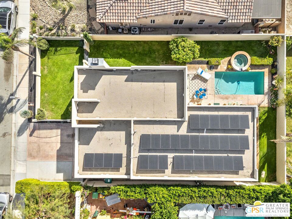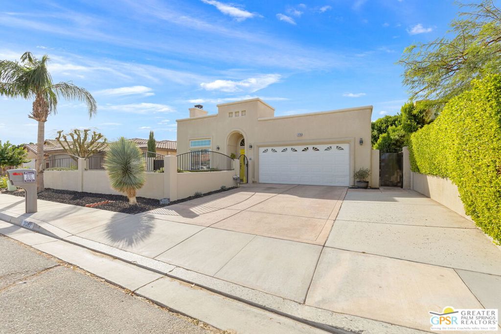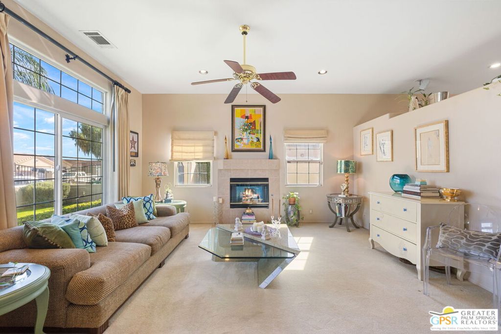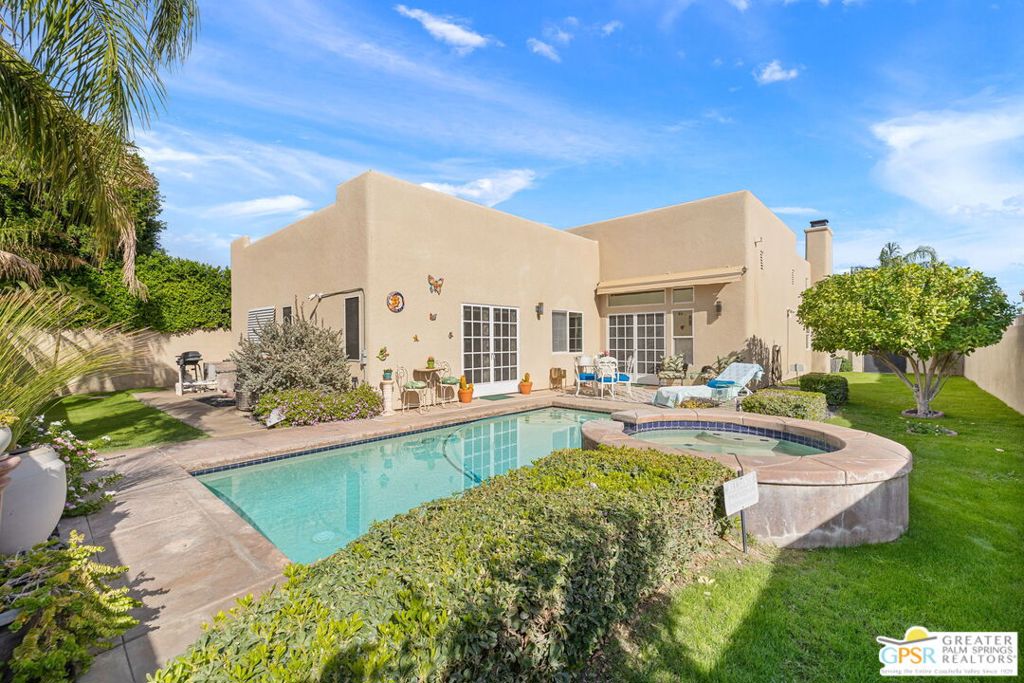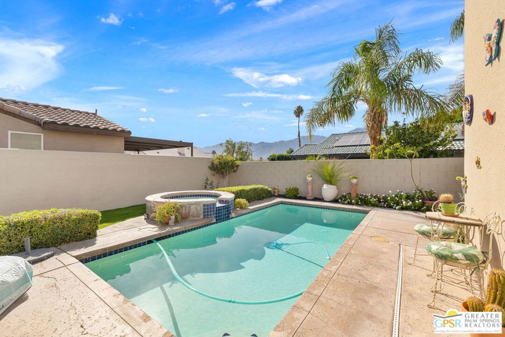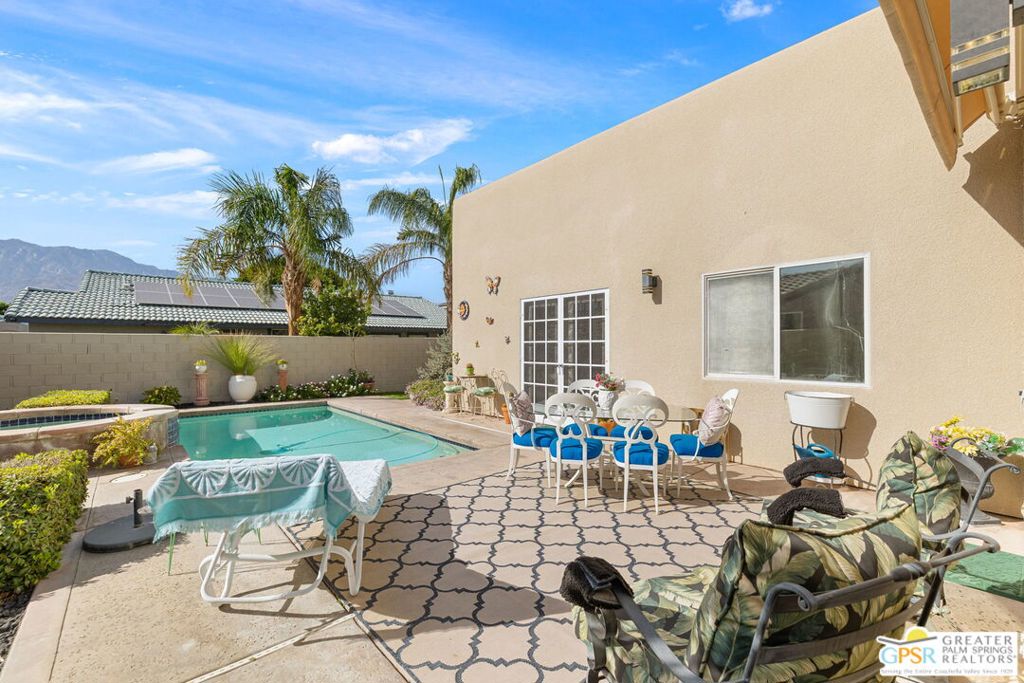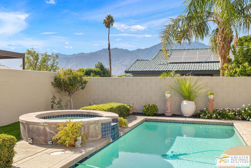 Discover this stunning 3-bedroom, 2-bath home with a den in beautiful Cathedral City, where breathtaking mountain views and modern comfort come together! Designed with an open-concept floor plan and high ceilings throughout, this home feels bright, spacious, and perfect for both relaxing and entertaining. The refurbished roof (just one year old) and leased solar panels add lasting value and energy savings. Step outside to your own private oasis. A sparkling pool and spa with a timed pool vacuum keeps everything pristine and ready for fun in the sun. Inside, enjoy the built-in surround sound system in the kitchen and family room, ideal for movie nights or gatherings. Both bathrooms feature double sinks, and one includes a private water closet with a pocket door for extra convenience. The attached 2-car garage offers built-in cabinets, shelving, and a workbench, providing plenty of space for storage or hobbies. Set in a quiet, friendly neighborhood, this home delivers the best of desert living style, comfort, and incredible views! (Note: Pool heater not working; fireplace painted but not fireproof.) Great location perfect for a family home or investment. Own your piece of Paradise today!