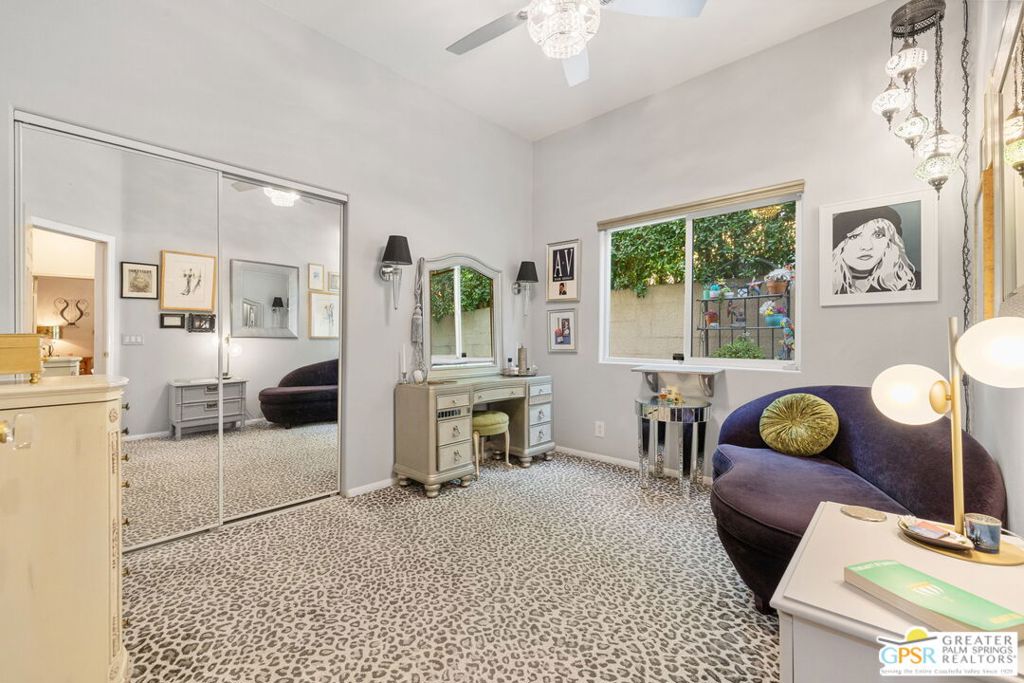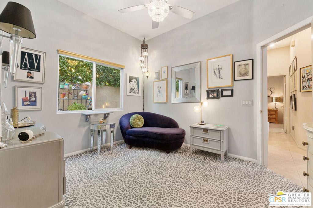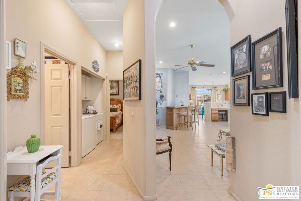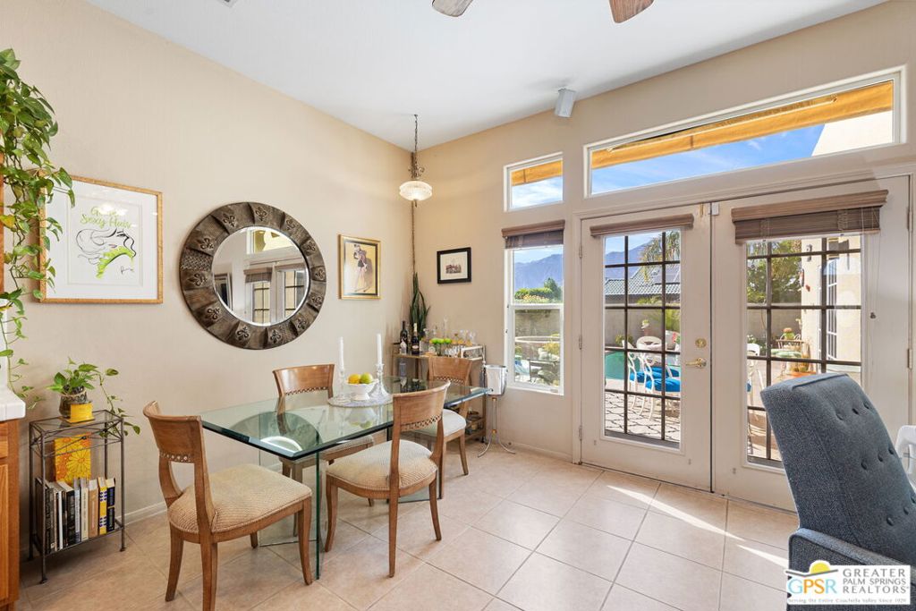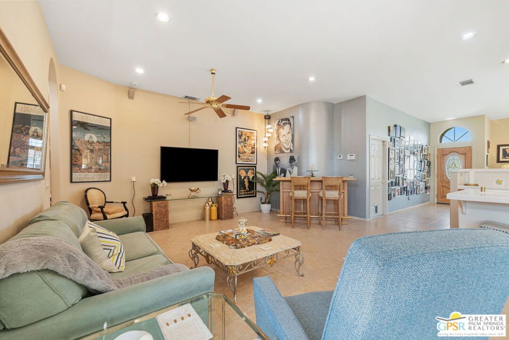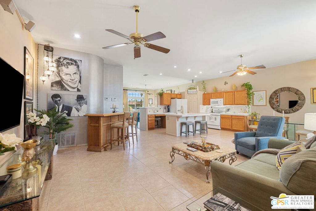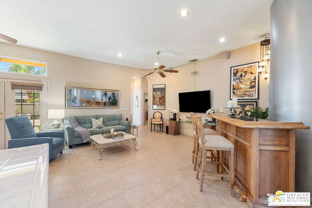 Discover this stunning 3-bedroom, 2-bath home with a den in beautiful Cathedral City, where breathtaking mountain views and modern comfort come together! Designed with an open-concept floor plan and high ceilings throughout, this home feels bright, spacious, and perfect for both relaxing and entertaining. The refurbished roof (just one year old) and leased solar panels add lasting value and energy savings. Step outside to your own private oasis. A sparkling pool and spa with a timed pool vacuum keeps everything pristine and ready for fun in the sun. Inside, enjoy the built-in surround sound system in the kitchen and family room, ideal for movie nights or gatherings. Both bathrooms feature double sinks, and one includes a private water closet with a pocket door for extra convenience. The attached 2-car garage offers built-in cabinets, shelving, and a workbench, providing plenty of space for storage or hobbies. Set in a quiet, friendly neighborhood, this home delivers the best of desert living style, comfort, and incredible views! (Note: Pool heater not working; fireplace painted but not fireproof.) Great location perfect for a family home or investment. Own your piece of Paradise today!