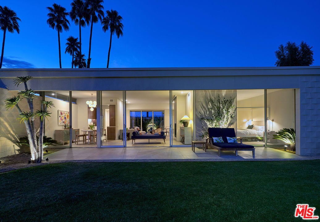 A stunning renovation of a mid-century classic at the sought after Seven Lakes Country Club. Originally designed by architect Richard Harrison in the late 60's, this recently renovated home boasts 10 foot tall floor-to-ceiling walls of glass, clerestory windows, a private patio & inspiring South facing mountain views. The home features new Italian porcelain floors throughout, gas burning fireplace, automated blinds in the living rm & an automated projection screen for movie nights. The chic kitchen features custom walnut cabinetry, quartz countertops, stainless KitchenAid appliances, wine fridge, farm sink & hand glazed tile backsplash. The smart range & faucet are both Alexa compatible. The large primary suite features walnut built-ins & a spa-like ensuite bath with Room & Board vanity. Additional features of the home include a new tankless water heater, washer/dryer inside, generous closet space & a single carport. There is also ample guest parking & easy pool access. Seven Lakes is a private golf community located by the Parker Hotel in South Palm Springs. With 24/7 gate guarded entry, amenities include a Ted Robinson designed 18 hole golf course, pro lessons, practice putting greens, 15 pools/spas (most with cabanas & grills), tennis court, William Cody designed clubhouse w/ dining rm, lively bar/lounge & outside terrace patio & mature landscaping.