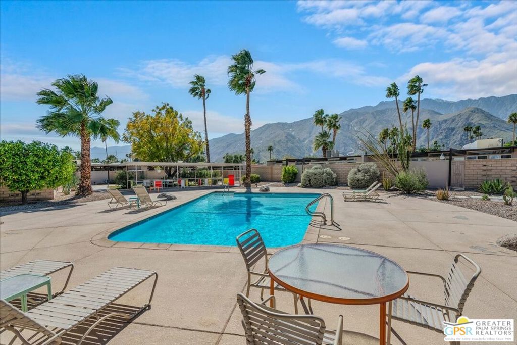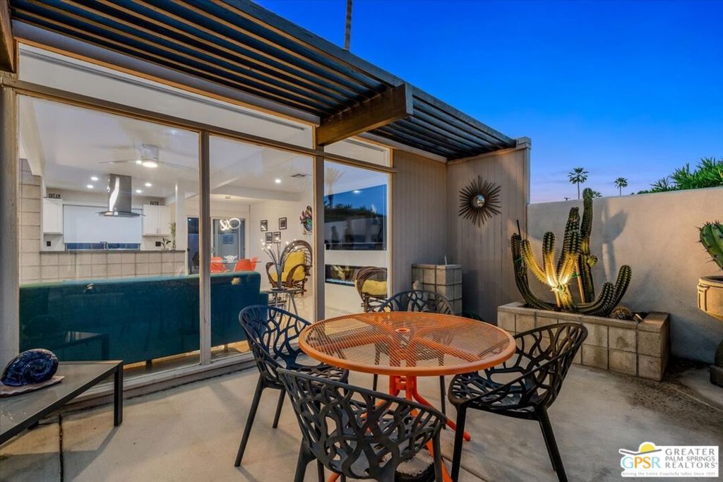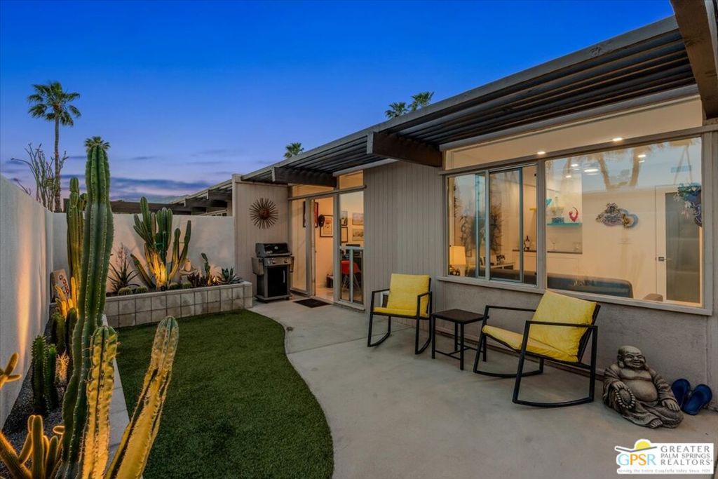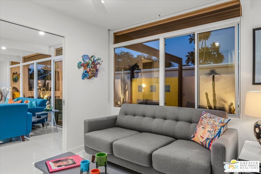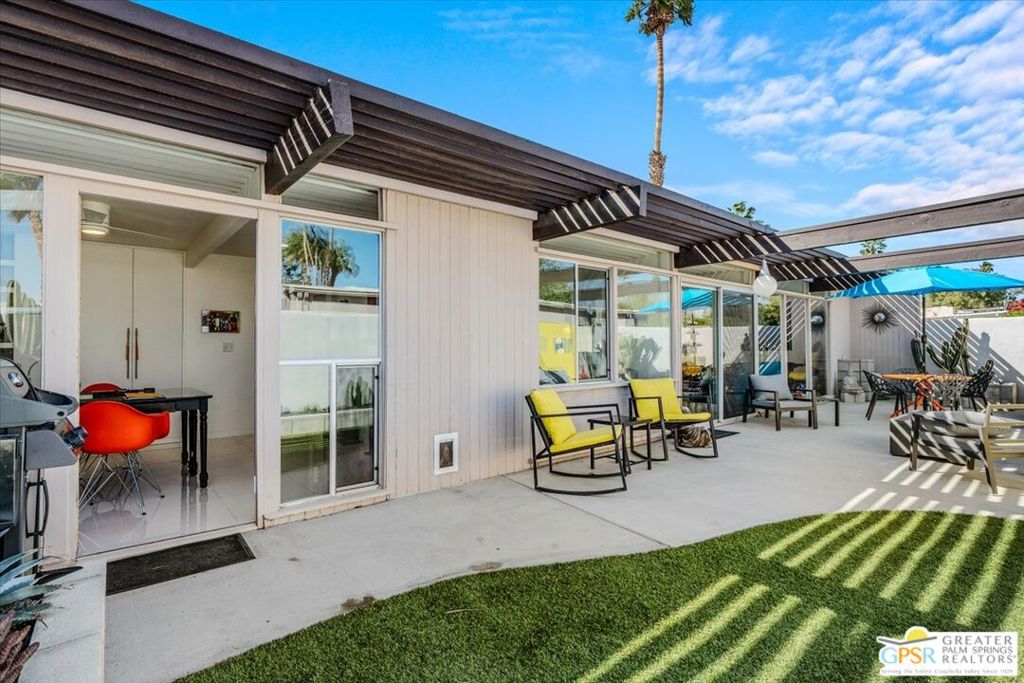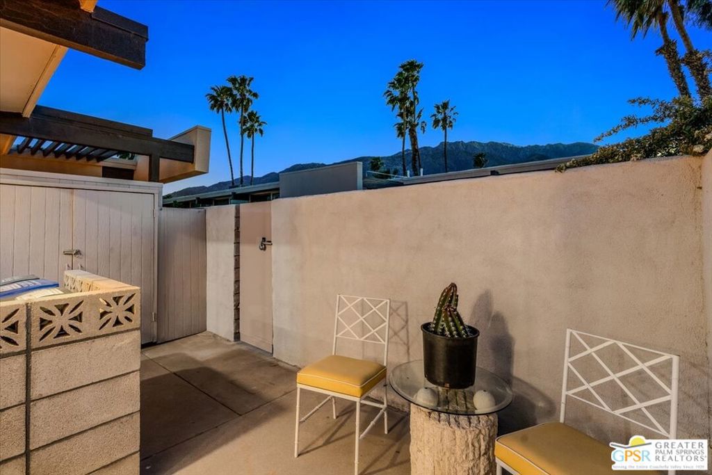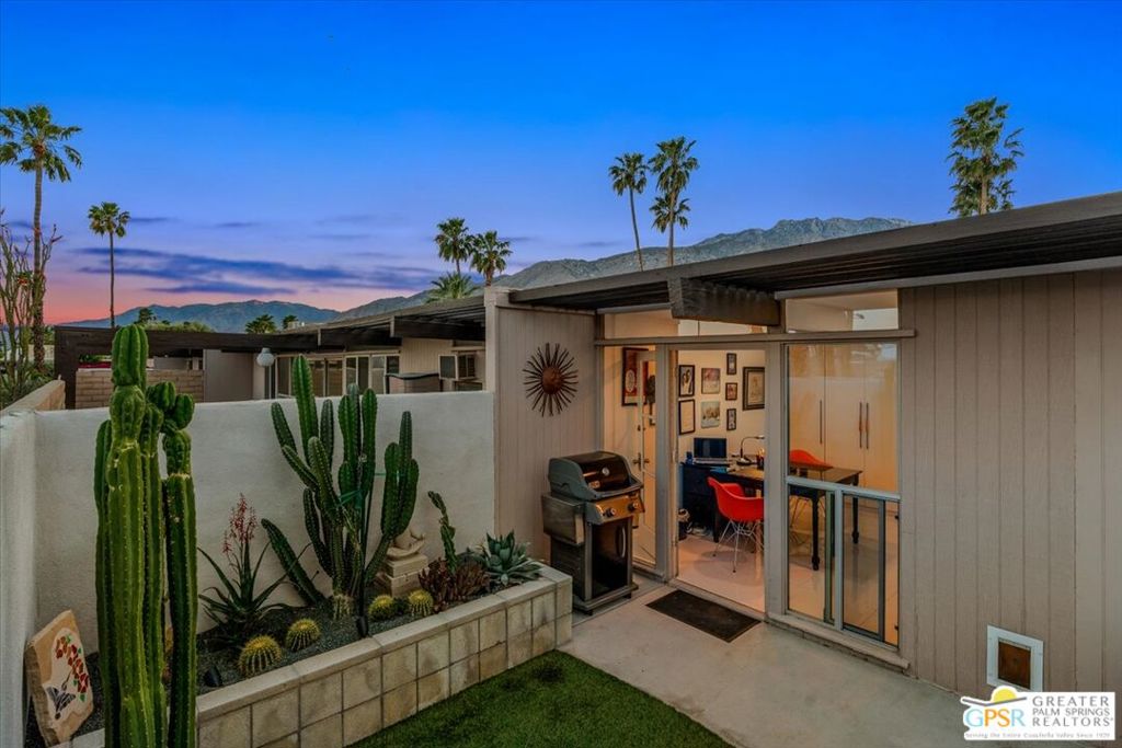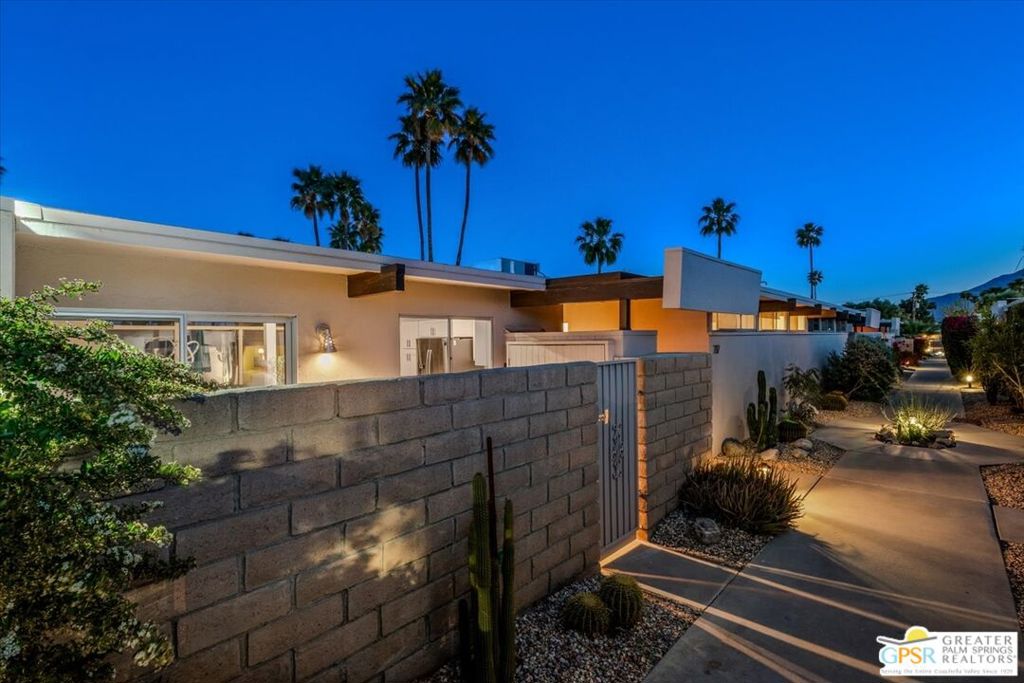 PRICE REDUCED! This extensively renovated and upgraded mid-century home is located in the Park Imperial North community and was featured on the Modernism community tour in 2024. An end unit, this condo lives like a single family home with only 1 shared wall and tons of privacy. Designed by Barry Berkus and completed in 1961, this home offers beamed ceilings, clerestory windows and floor to ceiling glass to a private patio. Boasting 2 bedrooms and 2 bathrooms and 1,236 square feet, this residence is the epitome of historic architecture and contemporary living. A media/family room can easily be utilized as a 3rd bedroom. Step inside to discover an airy and light-filled interior, complemented by sleek finishes and an open layout. A large fireplace is a focal point of the living space and provides warmth on those cool evenings. New 24x24 tile throughout and disappearing shades throughout. In the kitchen, custom cabinetry, quartz counters with a deep, stainless sink and upgraded appliances. Dual pane sliders in the living and dining areas by Melgar. The primary bedroom includes new lighting, soundproofing of the shared wall and closet with new built-ins. Both baths have been updated to include new tile and fixtures in the showers, water efficient toilets, floating vanities and beautiful lighting fixtures. A wall of glass brings light into the living and dining areas while providing access to the large, private patio with seating & dining areas. Fully landscaped, lit and irrigated raised flower beds. Spectacular mountain and sunset views! Be sure to check out the evening views on the patio! Park Imperial North offers 2 pools/spas and cabanas in a quiet setting. Whether you're seeking a serene retreat or a stylish home base for exploring the vibrant Palm Springs area, this residence is sure to impress. Don't miss the opportunity to call this modern gem your own and experience the best of desert living.
