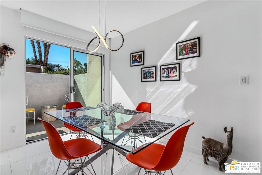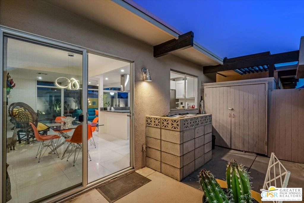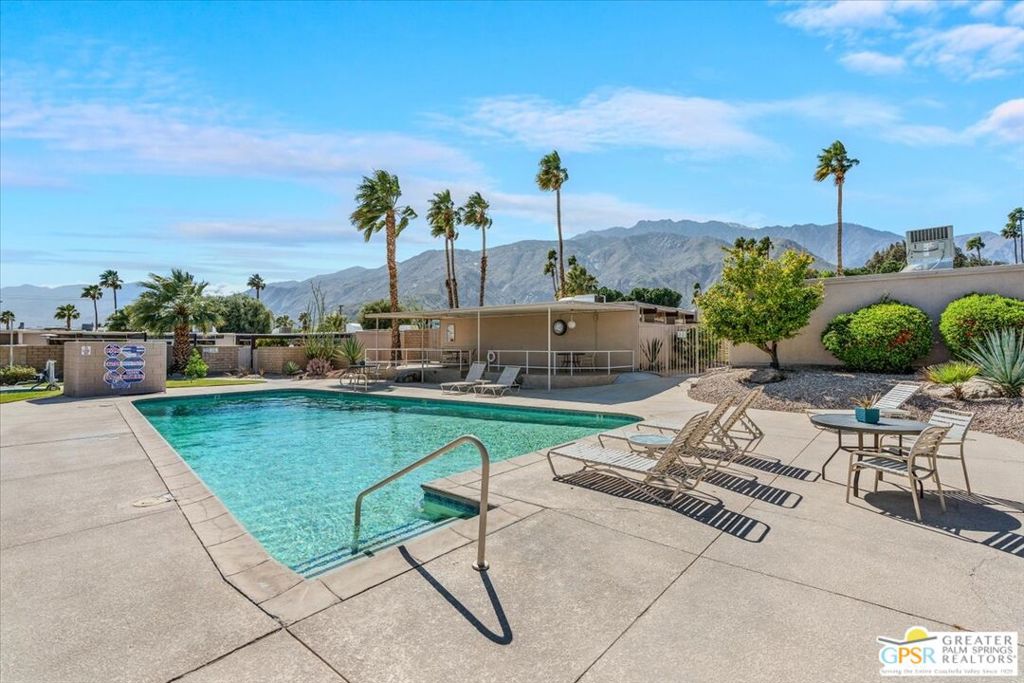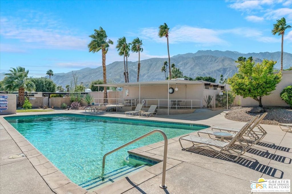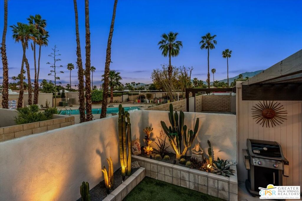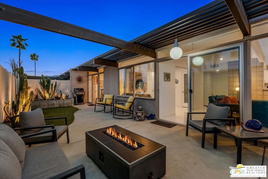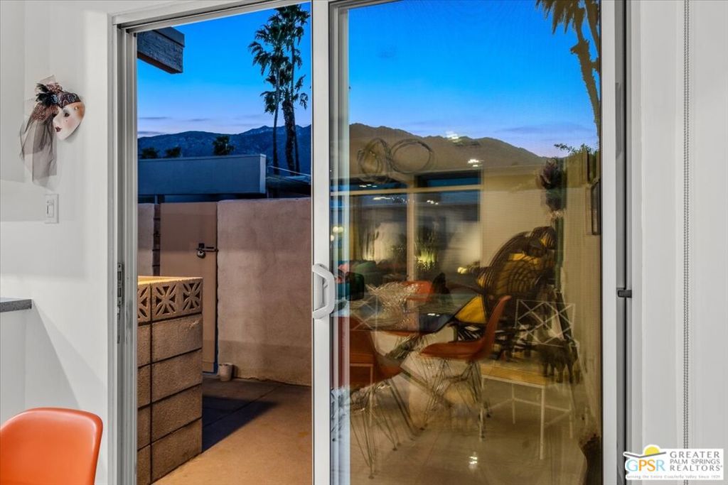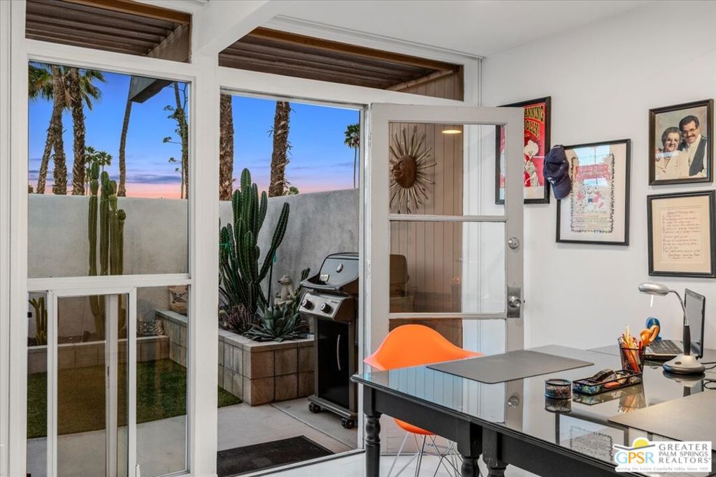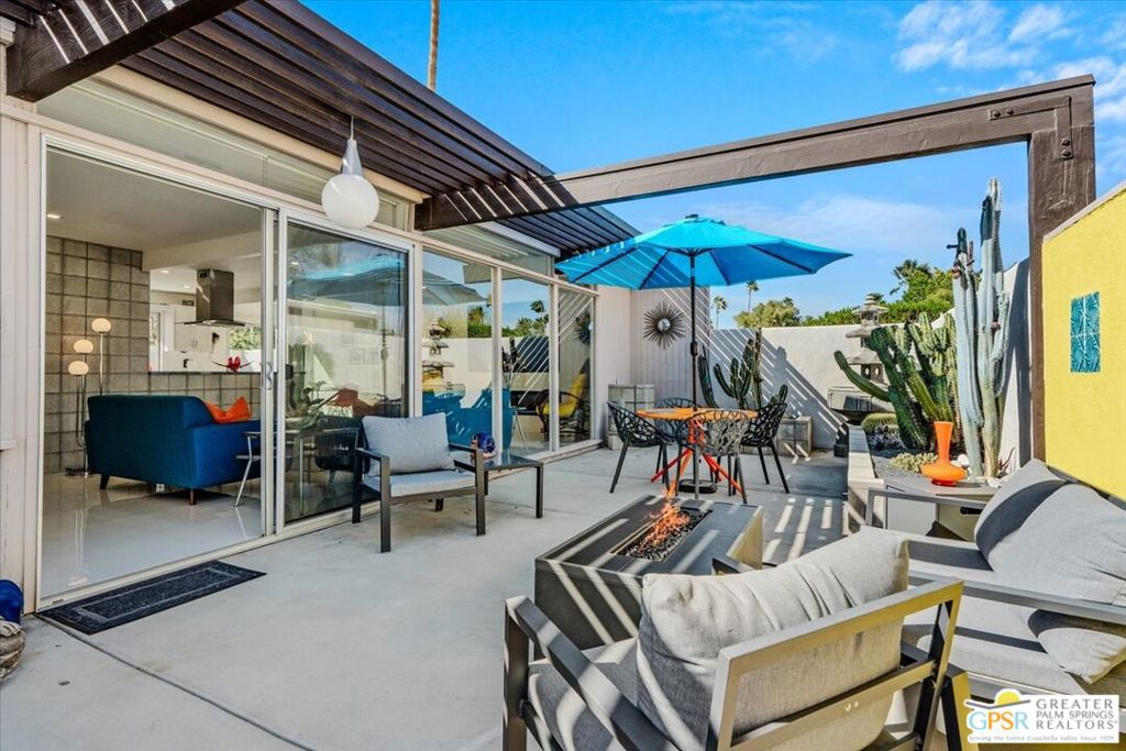 PRICE REDUCED! This extensively renovated and upgraded mid-century home is located in the Park Imperial North community and was featured on the Modernism community tour in 2024. An end unit, this condo lives like a single family home with only 1 shared wall and tons of privacy. Designed by Barry Berkus and completed in 1961, this home offers beamed ceilings, clerestory windows and floor to ceiling glass to a private patio. Boasting 2 bedrooms and 2 bathrooms and 1,236 square feet, this residence is the epitome of historic architecture and contemporary living. A media/family room can easily be utilized as a 3rd bedroom. Step inside to discover an airy and light-filled interior, complemented by sleek finishes and an open layout. A large fireplace is a focal point of the living space and provides warmth on those cool evenings. New 24x24 tile throughout and disappearing shades throughout. In the kitchen, custom cabinetry, quartz counters with a deep, stainless sink and upgraded appliances. Dual pane sliders in the living and dining areas by Melgar. The primary bedroom includes new lighting, soundproofing of the shared wall and closet with new built-ins. Both baths have been updated to include new tile and fixtures in the showers, water efficient toilets, floating vanities and beautiful lighting fixtures. A wall of glass brings light into the living and dining areas while providing access to the large, private patio with seating & dining areas. Fully landscaped, lit and irrigated raised flower beds. Spectacular mountain and sunset views! Be sure to check out the evening views on the patio! Park Imperial North offers 2 pools/spas and cabanas in a quiet setting. Whether you're seeking a serene retreat or a stylish home base for exploring the vibrant Palm Springs area, this residence is sure to impress. Don't miss the opportunity to call this modern gem your own and experience the best of desert living.