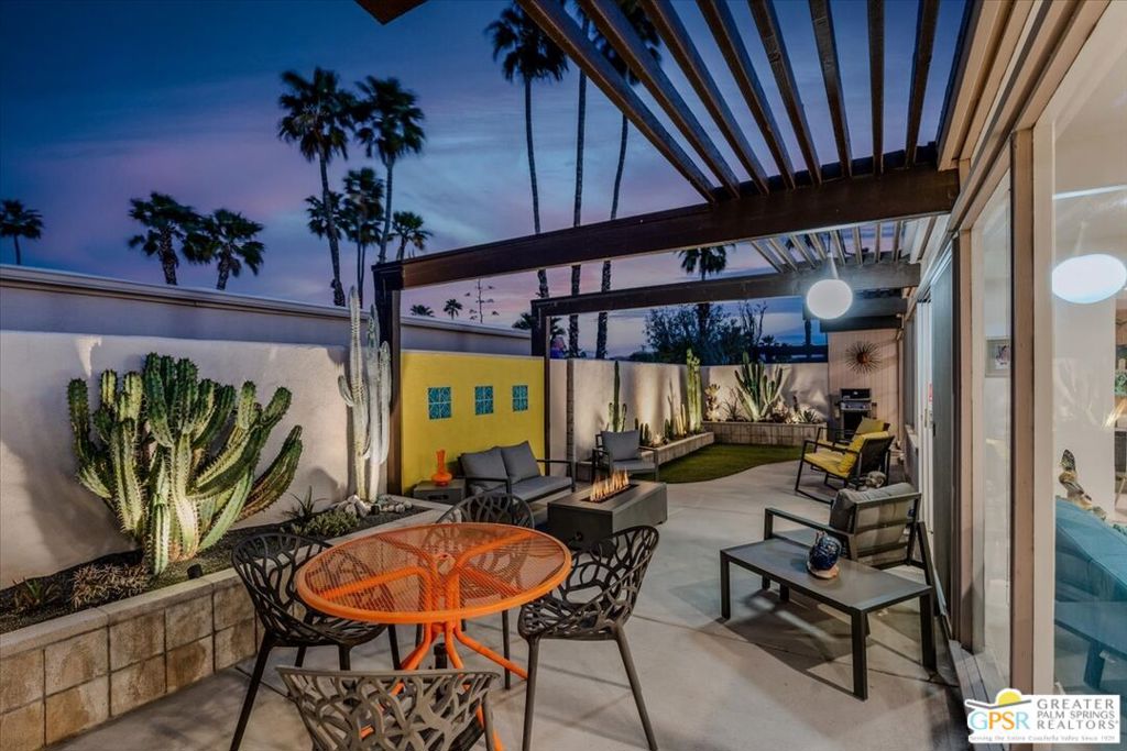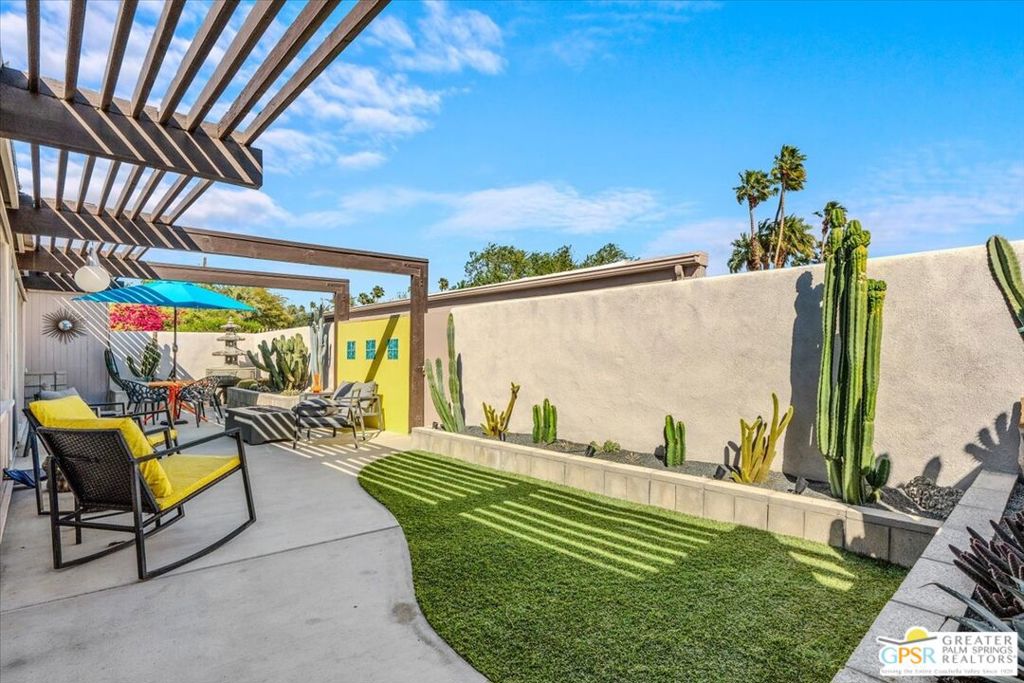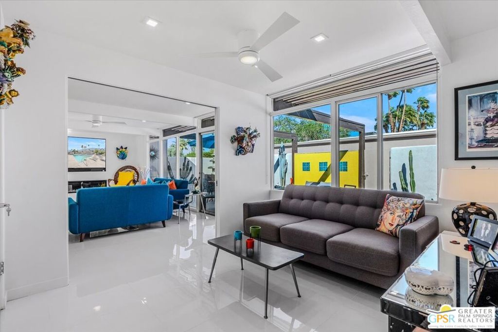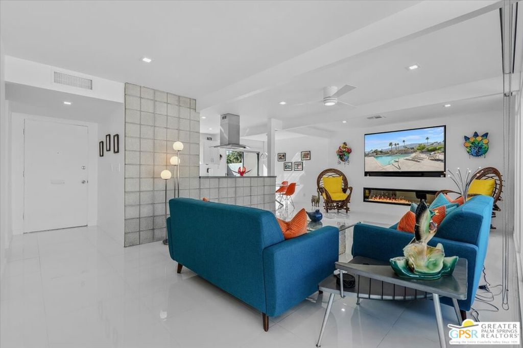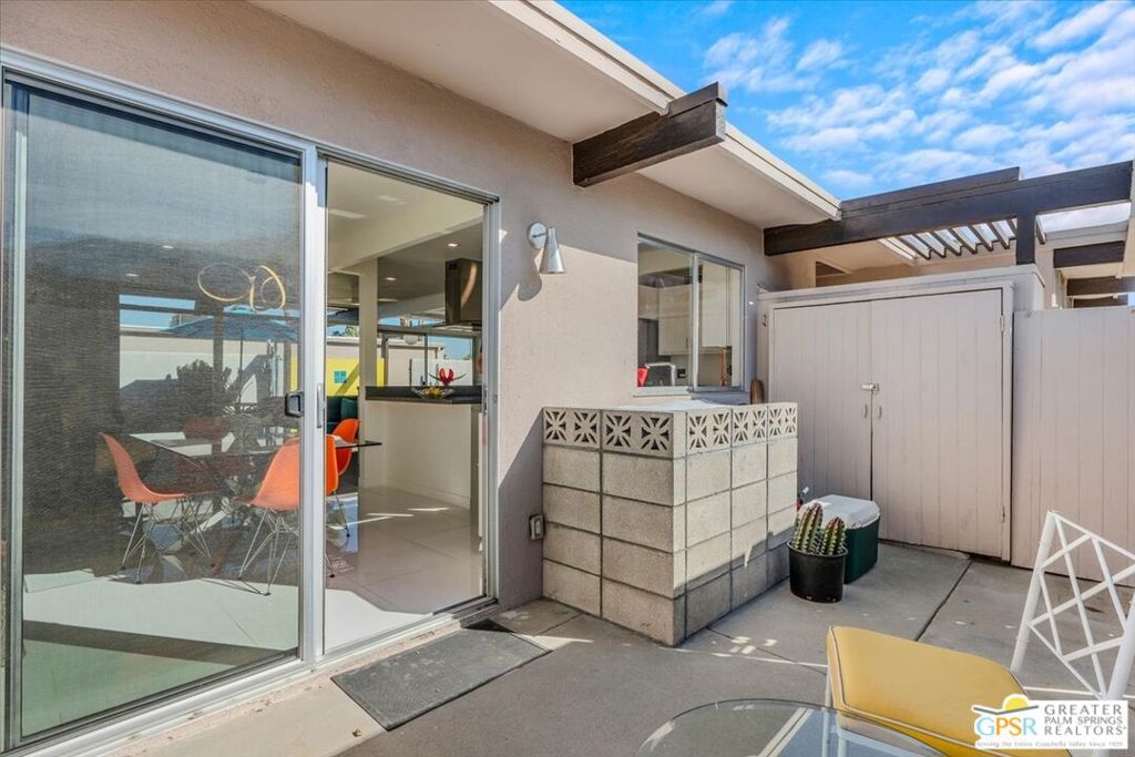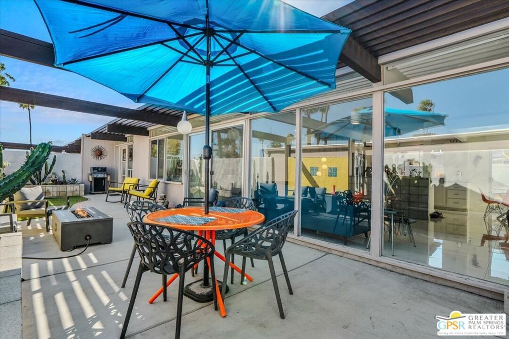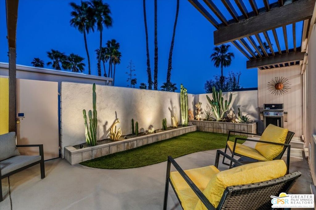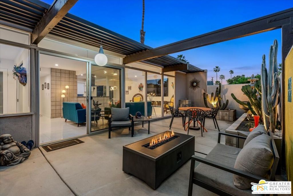 PRICE REDUCED! This extensively renovated and upgraded mid-century home is located in the Park Imperial North community and was featured on the Modernism community tour in 2024. An end unit, this condo lives like a single family home with only 1 shared wall and tons of privacy. Designed by Barry Berkus and completed in 1961, this home offers beamed ceilings, clerestory windows and floor to ceiling glass to a private patio. Boasting 2 bedrooms and 2 bathrooms and 1,236 square feet, this residence is the epitome of historic architecture and contemporary living. A media/family room can easily be utilized as a 3rd bedroom. Step inside to discover an airy and light-filled interior, complemented by sleek finishes and an open layout. A large fireplace is a focal point of the living space and provides warmth on those cool evenings. New 24x24 tile throughout and disappearing shades throughout. In the kitchen, custom cabinetry, quartz counters with a deep, stainless sink and upgraded appliances. Dual pane sliders in the living and dining areas by Melgar. The primary bedroom includes new lighting, soundproofing of the shared wall and closet with new built-ins. Both baths have been updated to include new tile and fixtures in the showers, water efficient toilets, floating vanities and beautiful lighting fixtures. A wall of glass brings light into the living and dining areas while providing access to the large, private patio with seating & dining areas. Fully landscaped, lit and irrigated raised flower beds. Spectacular mountain and sunset views! Be sure to check out the evening views on the patio! Park Imperial North offers 2 pools/spas and cabanas in a quiet setting. Whether you're seeking a serene retreat or a stylish home base for exploring the vibrant Palm Springs area, this residence is sure to impress. Don't miss the opportunity to call this modern gem your own and experience the best of desert living.