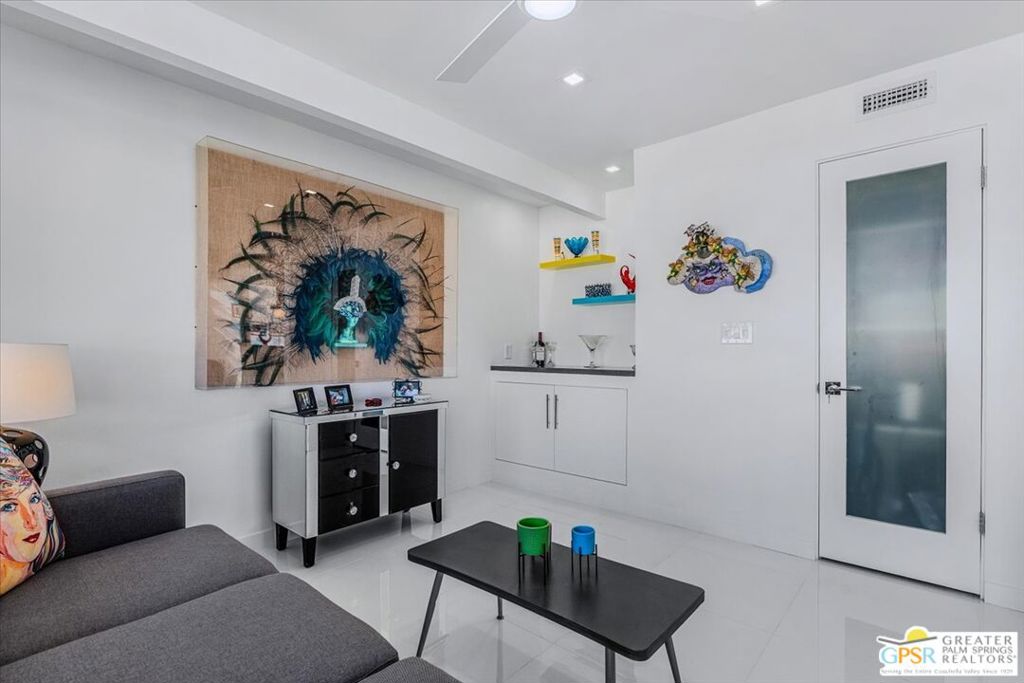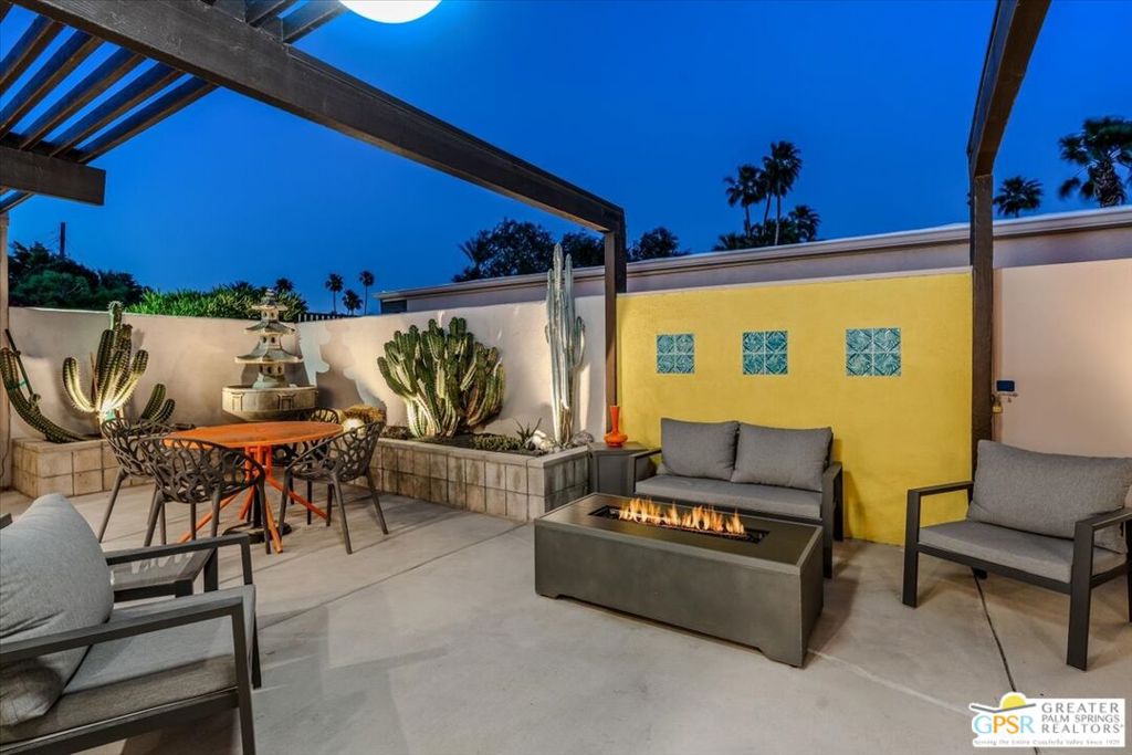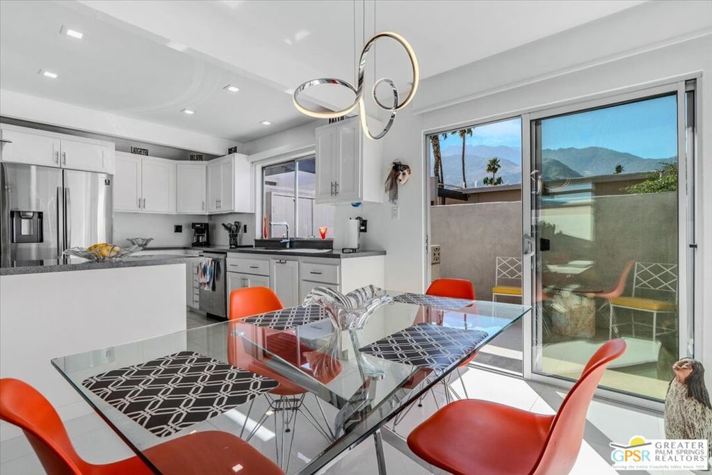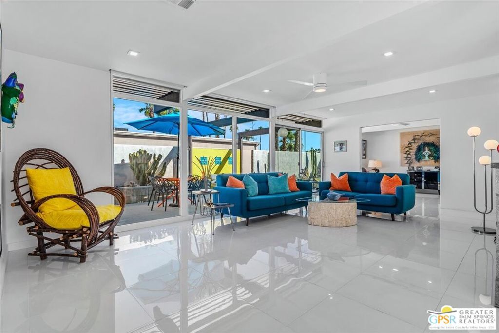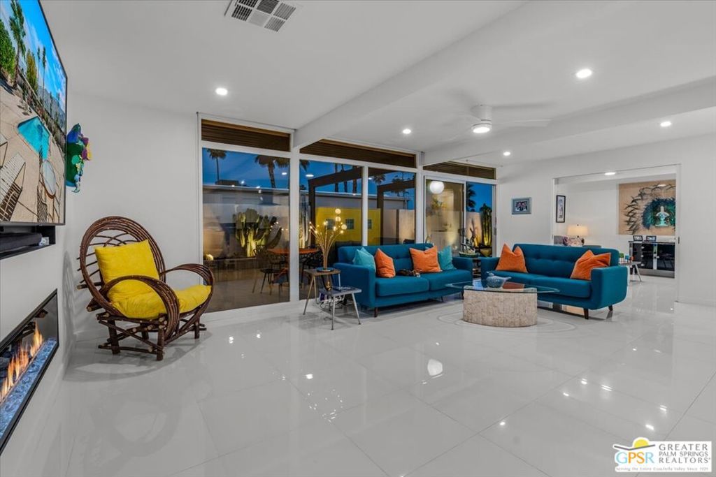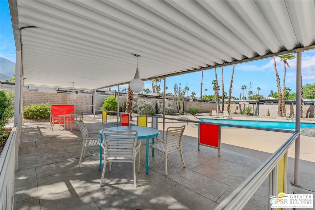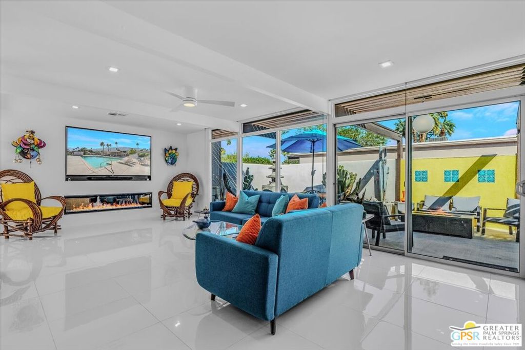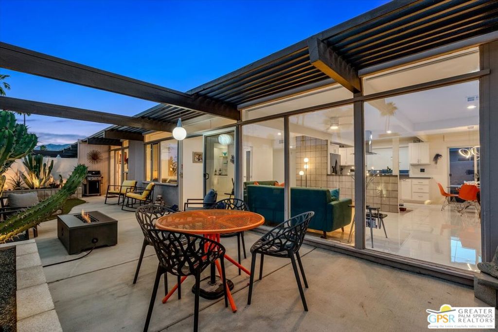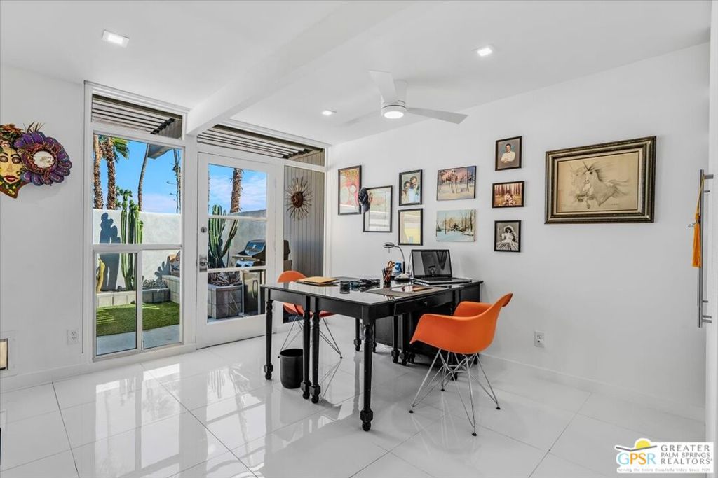 PRICE REDUCED! This extensively renovated and upgraded mid-century home is located in the Park Imperial North community and was featured on the Modernism community tour in 2024. An end unit, this condo lives like a single family home with only 1 shared wall and tons of privacy. Designed by Barry Berkus and completed in 1961, this home offers beamed ceilings, clerestory windows and floor to ceiling glass to a private patio. Boasting 2 bedrooms and 2 bathrooms and 1,236 square feet, this residence is the epitome of historic architecture and contemporary living. A media/family room can easily be utilized as a 3rd bedroom. Step inside to discover an airy and light-filled interior, complemented by sleek finishes and an open layout. A large fireplace is a focal point of the living space and provides warmth on those cool evenings. New 24x24 tile throughout and disappearing shades throughout. In the kitchen, custom cabinetry, quartz counters with a deep, stainless sink and upgraded appliances. Dual pane sliders in the living and dining areas by Melgar. The primary bedroom includes new lighting, soundproofing of the shared wall and closet with new built-ins. Both baths have been updated to include new tile and fixtures in the showers, water efficient toilets, floating vanities and beautiful lighting fixtures. A wall of glass brings light into the living and dining areas while providing access to the large, private patio with seating & dining areas. Fully landscaped, lit and irrigated raised flower beds. Spectacular mountain and sunset views! Be sure to check out the evening views on the patio! Park Imperial North offers 2 pools/spas and cabanas in a quiet setting. Whether you're seeking a serene retreat or a stylish home base for exploring the vibrant Palm Springs area, this residence is sure to impress. Don't miss the opportunity to call this modern gem your own and experience the best of desert living.