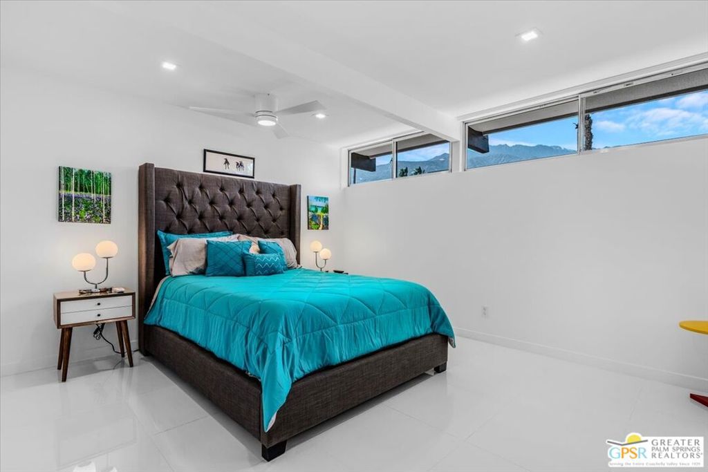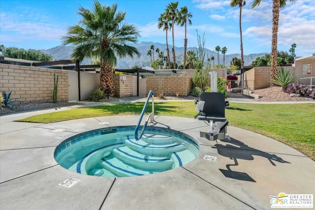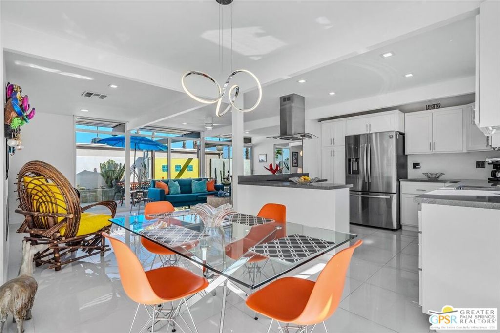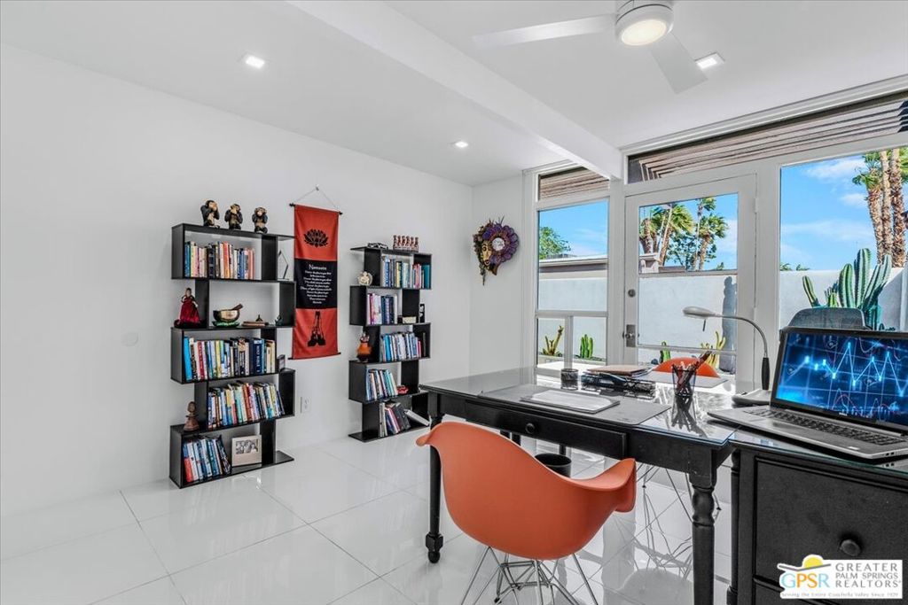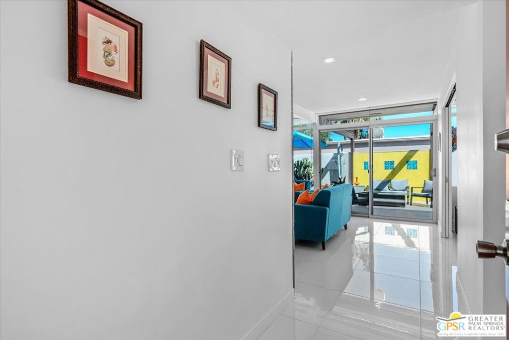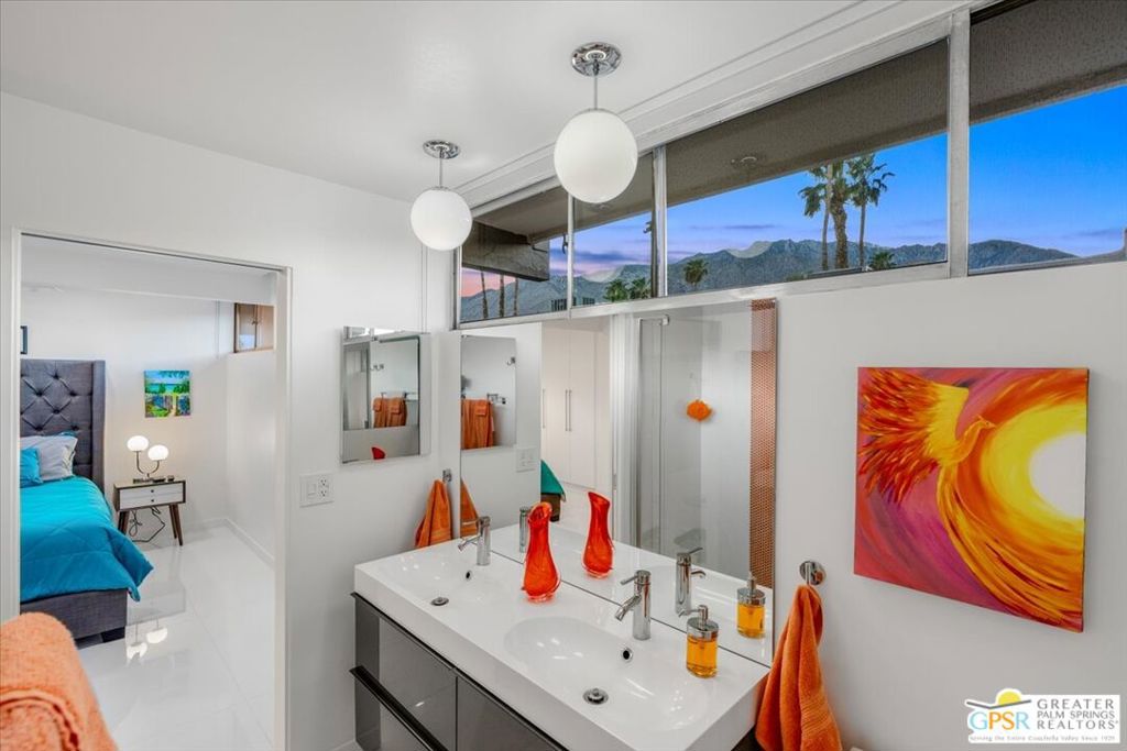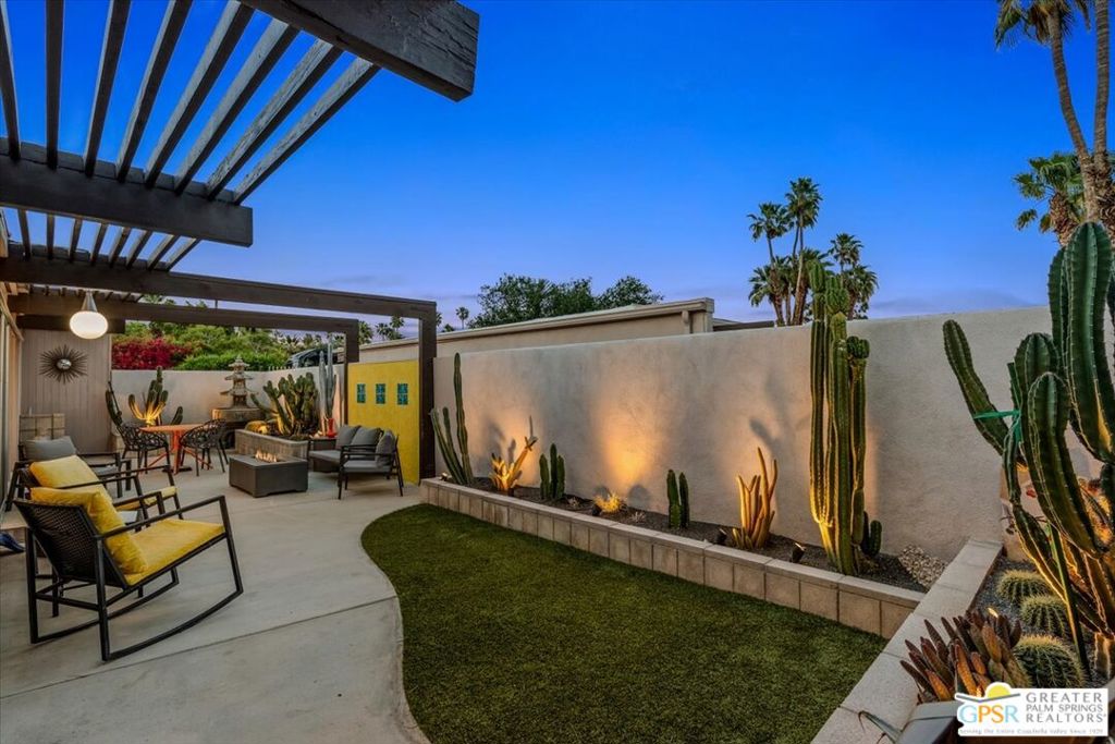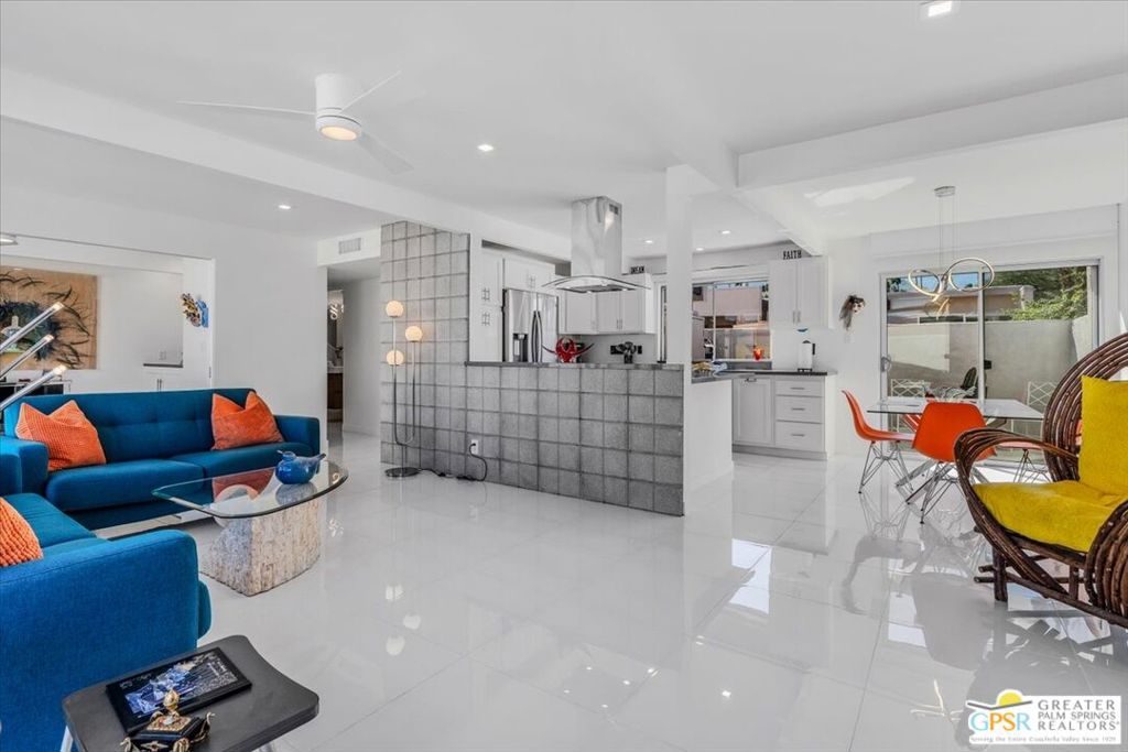 PRICE REDUCED! This extensively renovated and upgraded mid-century home is located in the Park Imperial North community and was featured on the Modernism community tour in 2024. An end unit, this condo lives like a single family home with only 1 shared wall and tons of privacy. Designed by Barry Berkus and completed in 1961, this home offers beamed ceilings, clerestory windows and floor to ceiling glass to a private patio. Boasting 2 bedrooms and 2 bathrooms and 1,236 square feet, this residence is the epitome of historic architecture and contemporary living. A media/family room can easily be utilized as a 3rd bedroom. Step inside to discover an airy and light-filled interior, complemented by sleek finishes and an open layout. A large fireplace is a focal point of the living space and provides warmth on those cool evenings. New 24x24 tile throughout and disappearing shades throughout. In the kitchen, custom cabinetry, quartz counters with a deep, stainless sink and upgraded appliances. Dual pane sliders in the living and dining areas by Melgar. The primary bedroom includes new lighting, soundproofing of the shared wall and closet with new built-ins. Both baths have been updated to include new tile and fixtures in the showers, water efficient toilets, floating vanities and beautiful lighting fixtures. A wall of glass brings light into the living and dining areas while providing access to the large, private patio with seating & dining areas. Fully landscaped, lit and irrigated raised flower beds. Spectacular mountain and sunset views! Be sure to check out the evening views on the patio! Park Imperial North offers 2 pools/spas and cabanas in a quiet setting. Whether you're seeking a serene retreat or a stylish home base for exploring the vibrant Palm Springs area, this residence is sure to impress. Don't miss the opportunity to call this modern gem your own and experience the best of desert living.