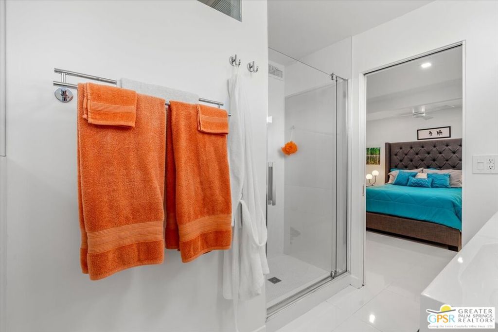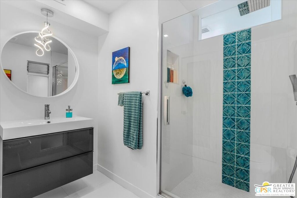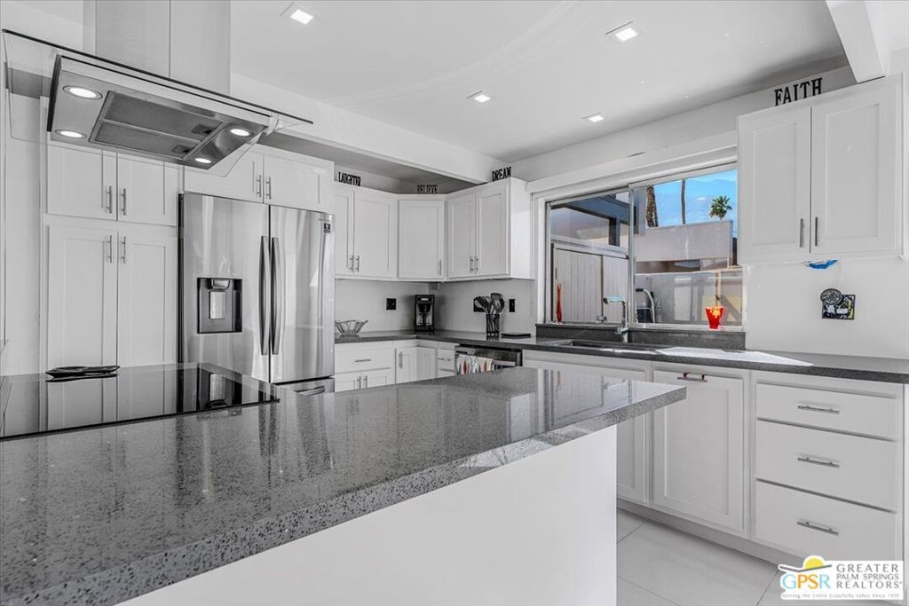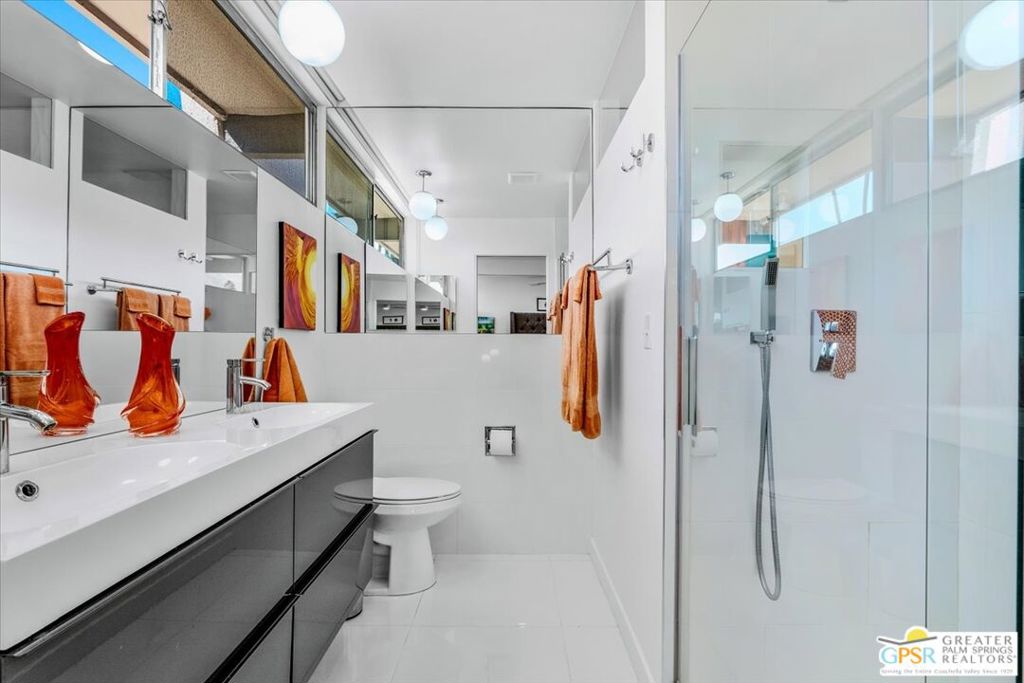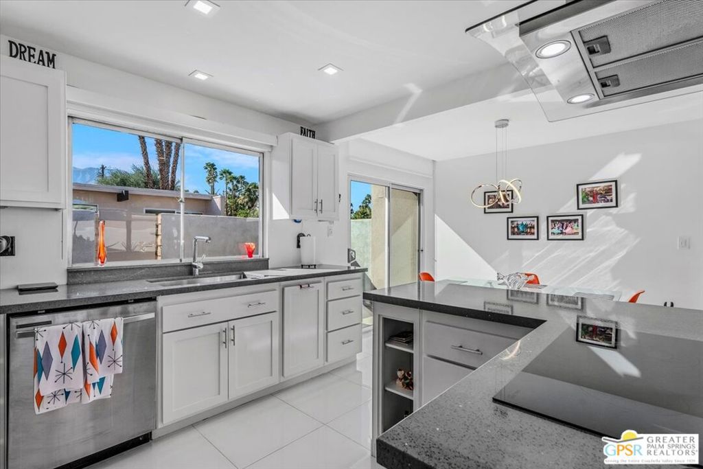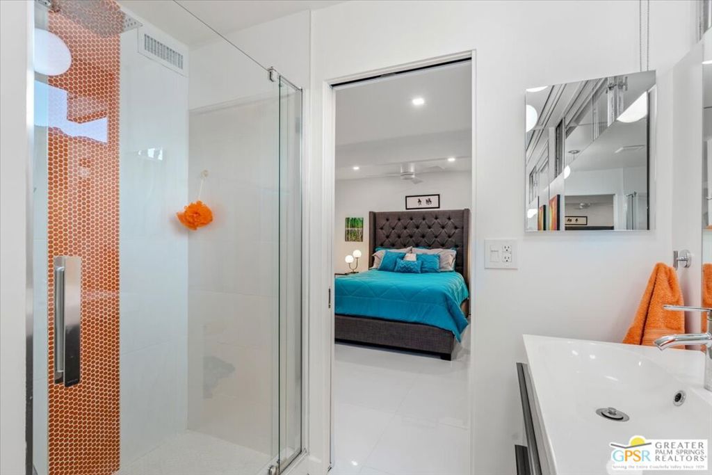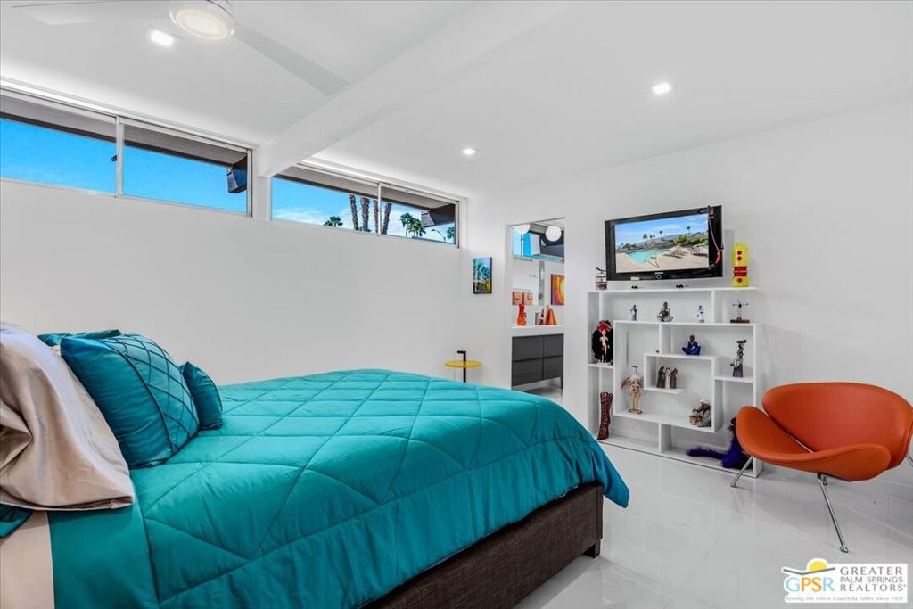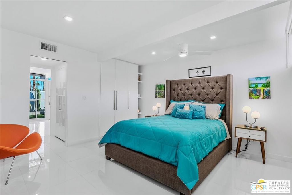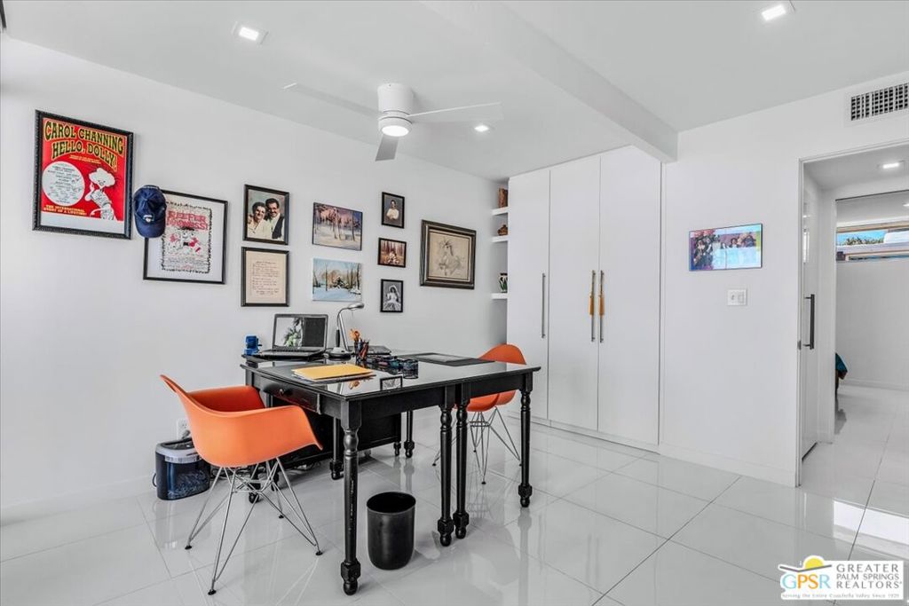 PRICE REDUCED! This extensively renovated and upgraded mid-century home is located in the Park Imperial North community and was featured on the Modernism community tour in 2024. An end unit, this condo lives like a single family home with only 1 shared wall and tons of privacy. Designed by Barry Berkus and completed in 1961, this home offers beamed ceilings, clerestory windows and floor to ceiling glass to a private patio. Boasting 2 bedrooms and 2 bathrooms and 1,236 square feet, this residence is the epitome of historic architecture and contemporary living. A media/family room can easily be utilized as a 3rd bedroom. Step inside to discover an airy and light-filled interior, complemented by sleek finishes and an open layout. A large fireplace is a focal point of the living space and provides warmth on those cool evenings. New 24x24 tile throughout and disappearing shades throughout. In the kitchen, custom cabinetry, quartz counters with a deep, stainless sink and upgraded appliances. Dual pane sliders in the living and dining areas by Melgar. The primary bedroom includes new lighting, soundproofing of the shared wall and closet with new built-ins. Both baths have been updated to include new tile and fixtures in the showers, water efficient toilets, floating vanities and beautiful lighting fixtures. A wall of glass brings light into the living and dining areas while providing access to the large, private patio with seating & dining areas. Fully landscaped, lit and irrigated raised flower beds. Spectacular mountain and sunset views! Be sure to check out the evening views on the patio! Park Imperial North offers 2 pools/spas and cabanas in a quiet setting. Whether you're seeking a serene retreat or a stylish home base for exploring the vibrant Palm Springs area, this residence is sure to impress. Don't miss the opportunity to call this modern gem your own and experience the best of desert living.